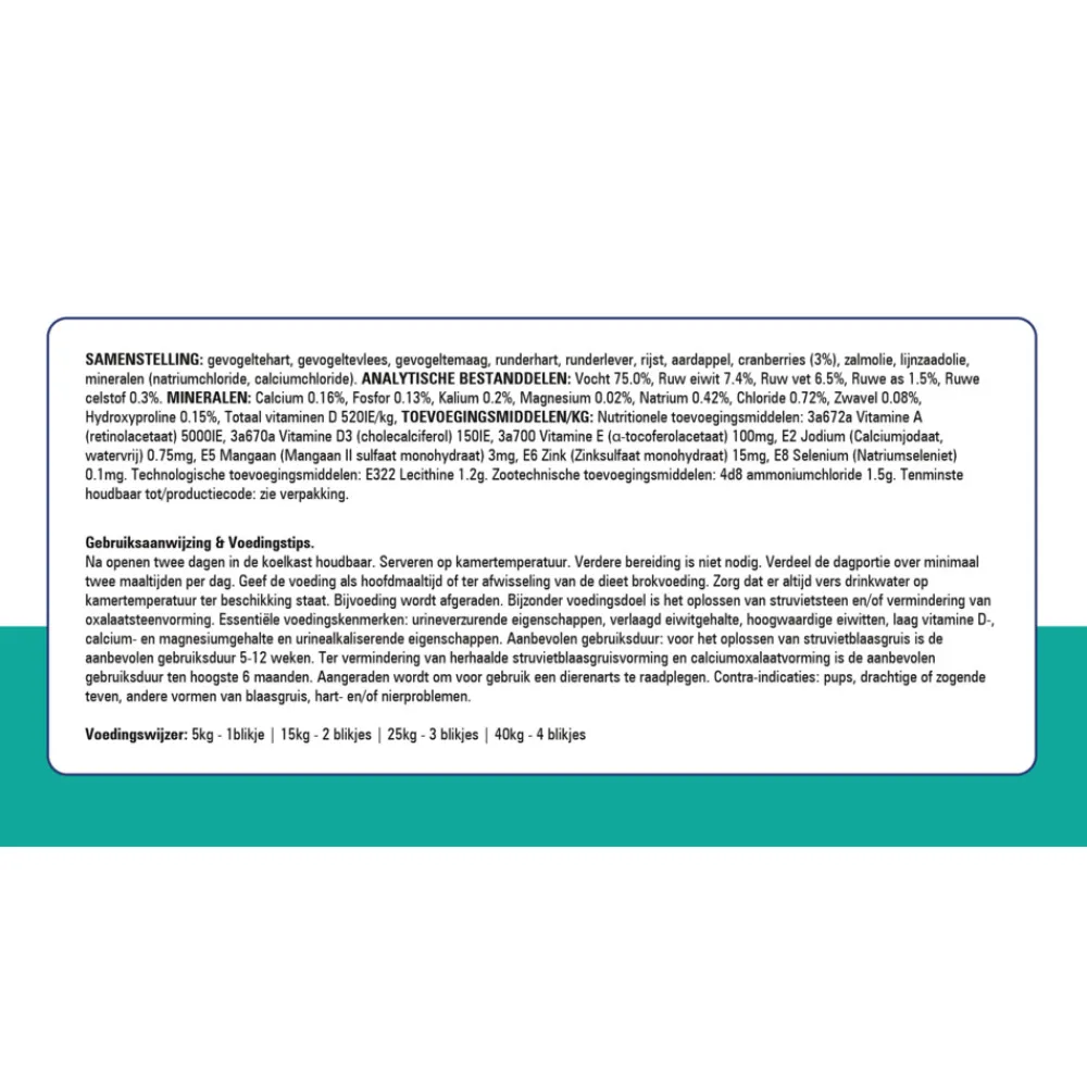 Na openen twee dagen in de koelkast houdbaar. Serveren op kamertemperatuur. Verdere bereiding is niet nodig. Verdeel de dagportie over minimaal twee maaltijden per dag. Geef de voeding als hoofdmaaltijd of ter afwisseling van de dieet brokvoeding. Zorg dat er altijd vers drinkwater op kamertemperatuur ter beschikking staat. Bijvoeding wordt afgeraden. Bijzonder voedingsdoel is het oplossen van struvietsteen en/of vermindering van oxalaatsteenvorming. Essentiële voedingskenmerken: urineverzurende eigenschappen, verlaagd eiwitgehalte, hoogwaardige eiwitten, laag vitamine D-, calcium- en magnesiumgehalte en urinealkaliserende eigenschappen.