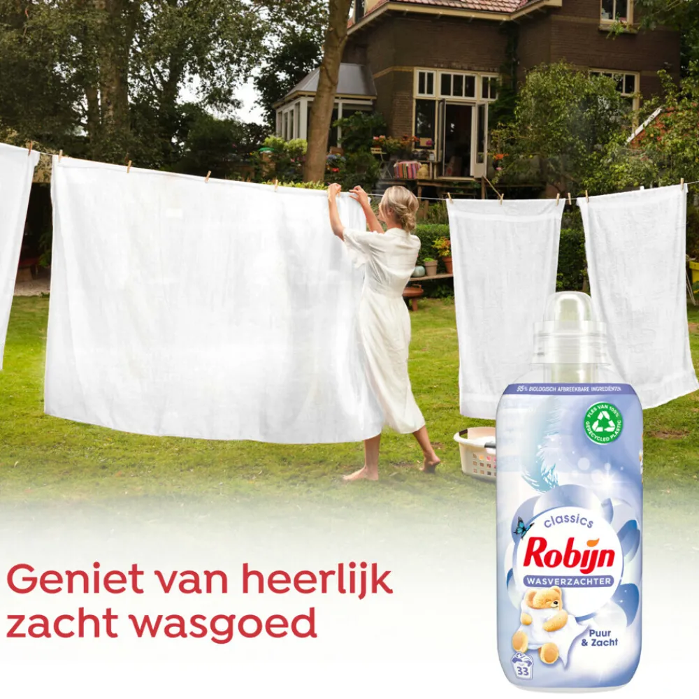 Waarom Robijn Classics Puur & Zacht Wasverzachter? Robijn Classics Puur & Zacht Wasverzachter houdt je was fris en lekker zacht. Geniet van de heerlijke geur en langdurige frisheid. Dermatologisch getest en geschikt voor de gevoelige babyhuid. De wasverzachter zorgt ook voor een speciale beschermlaag rondom de vezels van de stof. Hierdoor ontstaat er minder wrijving tussen de vezels, met als gevolg dat je kleding minder snel slijt en zijn pasvorm en kleuren behoudt. Daarnaast is je kleding makkelijker strijkbaar en droogt het sneller. De Robijn Classics Puur & Zacht Wasverzachter bevat ingrediënten die voor 95% biologisch afbreekbaar zijn*. Bovendien zijn de flessen van Robijn wasverzachter gemaakt van 100% gerecycled plastic en 100% recyclebaar. Zo blijft je kleding heerlijk zacht en zorg je tegelijkertijd beter voor het milieu.