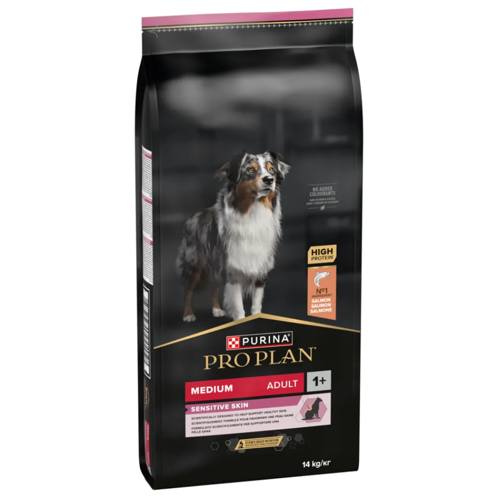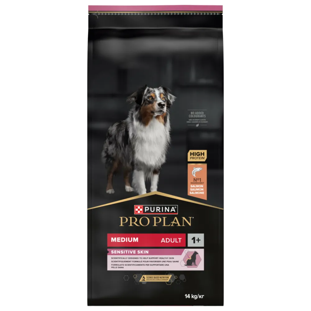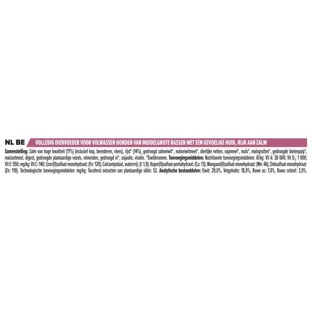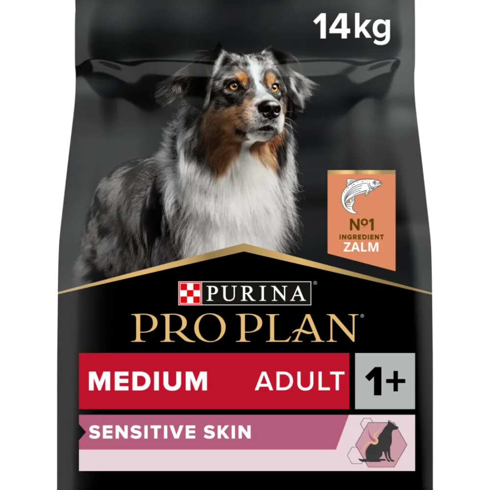 Pro Plan Adult Medium Sensitive Skin Zalm (voorheen OptiDerma) bevat alle voedingsstoffen die een hond nodig heeft om in zijn behoefte te voorzien – plus voedingsstoffen voor het ondersteunen van een gezonde huid en glanzende vacht. Deze voeding bevat een speciale combinatie van voedingstoffen gericht op de huid, zoals eiwitbronnen uit aminozuren, essentiële vetzuren, B vitaminen en zink, die aantoonbaar een gezonde huid en glanzende vacht ondersteunen.