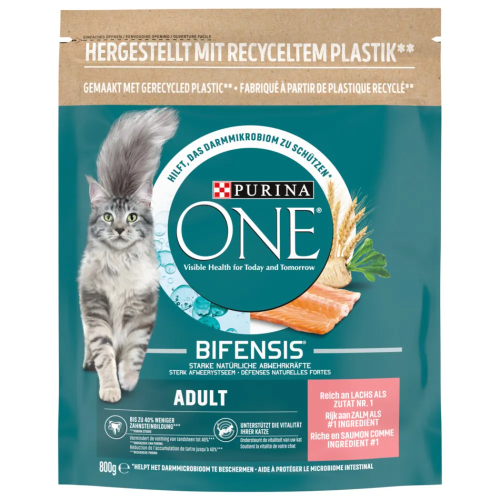 Zalm (17%), gedroogde gevogelte-eiwitten, volkoren tarwe (17%), maïs, sojameel, tarweglutenmeel, maïsglutenmeel, dierlijk vet, gedroogde cichoreiwortel, maïsgries, gedroogde bietenpulp, mineralen, digest (met toegevoegd hittebehandeld Lactobacillus Delbrueckii en Fermentum poeder (0,025%)), gist.