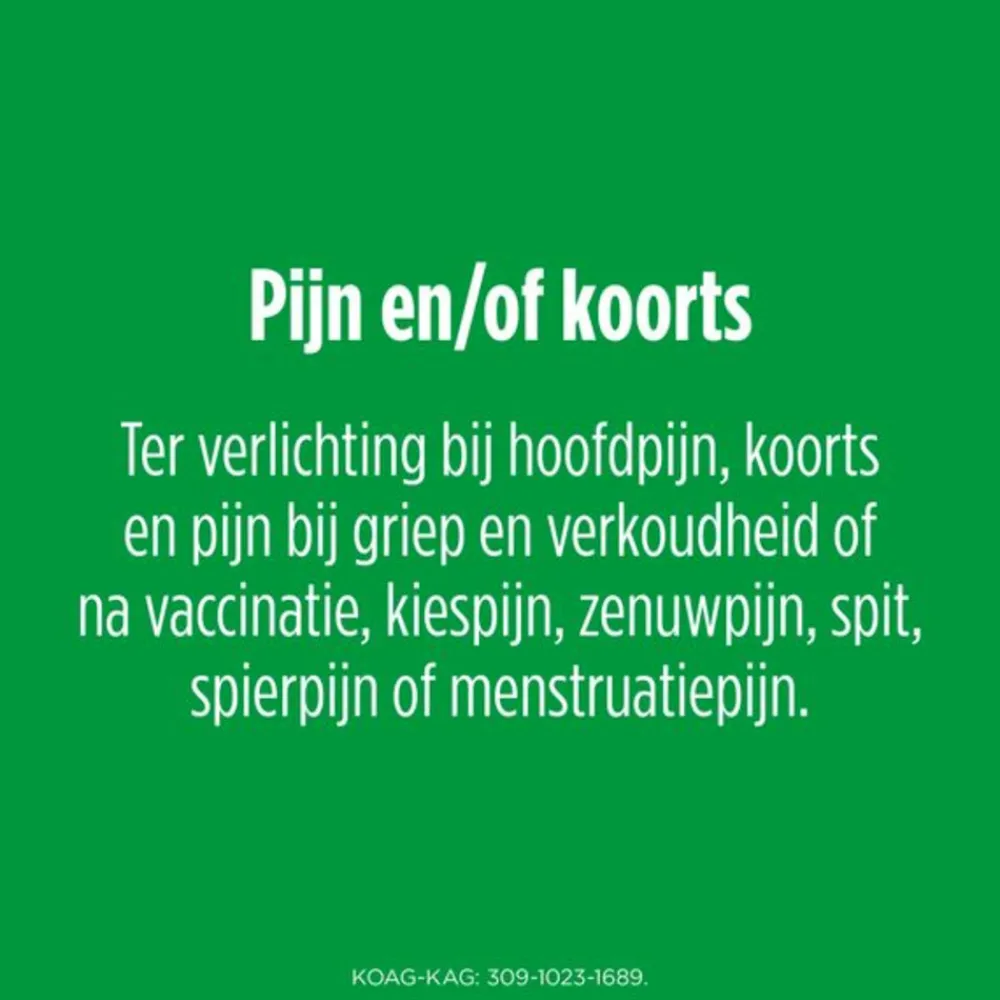 | Te gebruiken bij | Te gebruiken bij de symptomatische behandeling van milde tot matige pijn en/of koorts. |