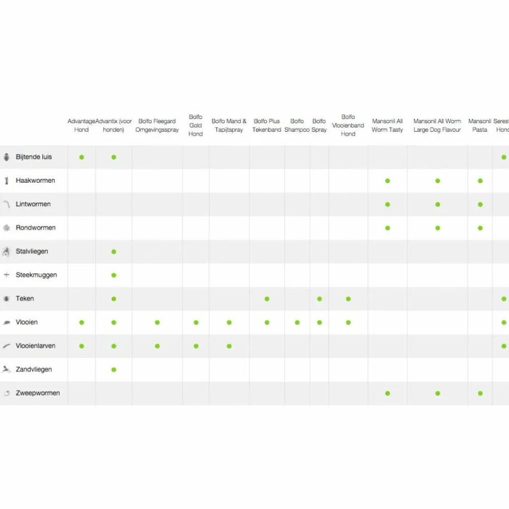 Mansonil All Worm is een ontwormingsmiddel met een brede werking. Het doodt de belangrijkste rond- en lintwormen die bij de hond voorkomen na een éénmalige behandeling.