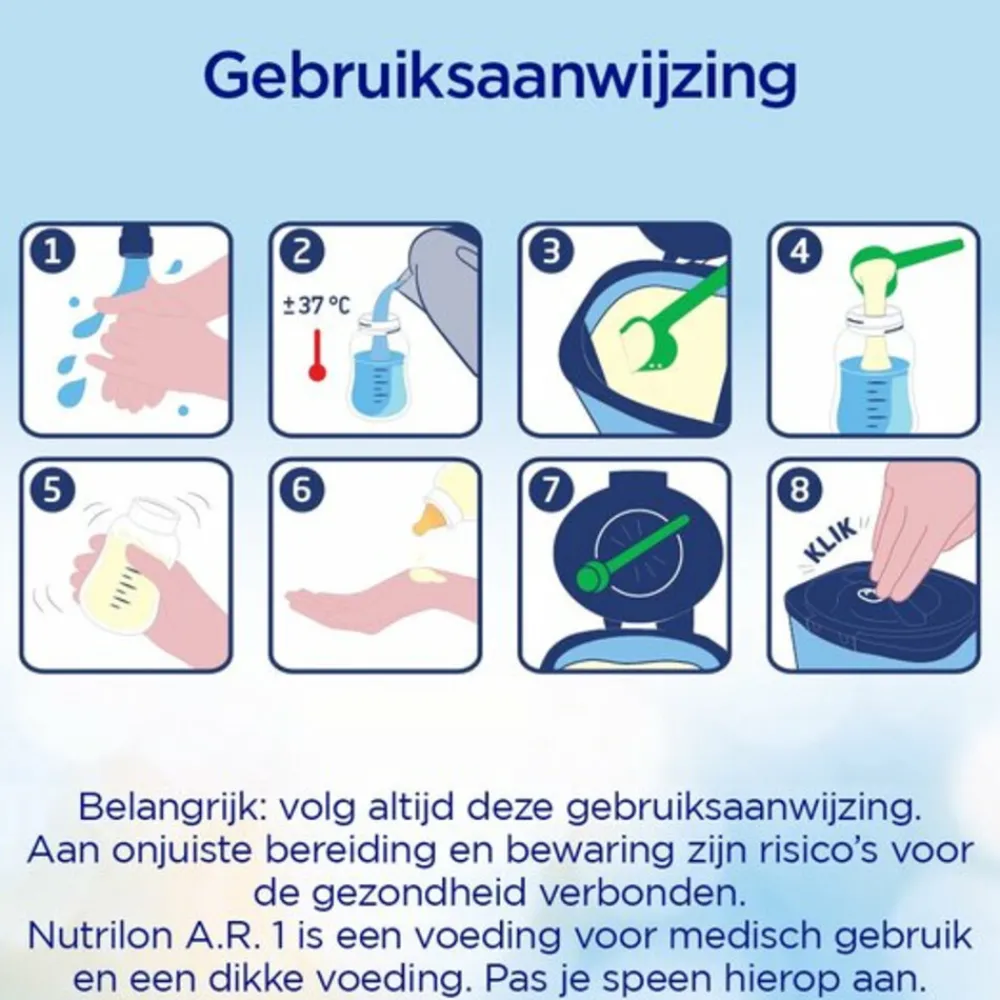 Nutrilon A.R. 1 van Nutricia is een dieetvoeding bij spugen voor kindjes van 0 tot 6 maanden. Het kan gebruikt worden vanaf de geboorte, ook in combinatie met borstvoeding. Het heeft een aangepaste eiwitverhouding en bevat voorgekookt johannesbroodpitmeel. Nutrilon A.R. 1 bevat nucleotiden en DHA. Belangrijk. Borstvoeding is de beste voeding voor je baby overleg met je arts of consultatiebureau voordat je Nutrilon A.R. 1 gaat gebruiken.