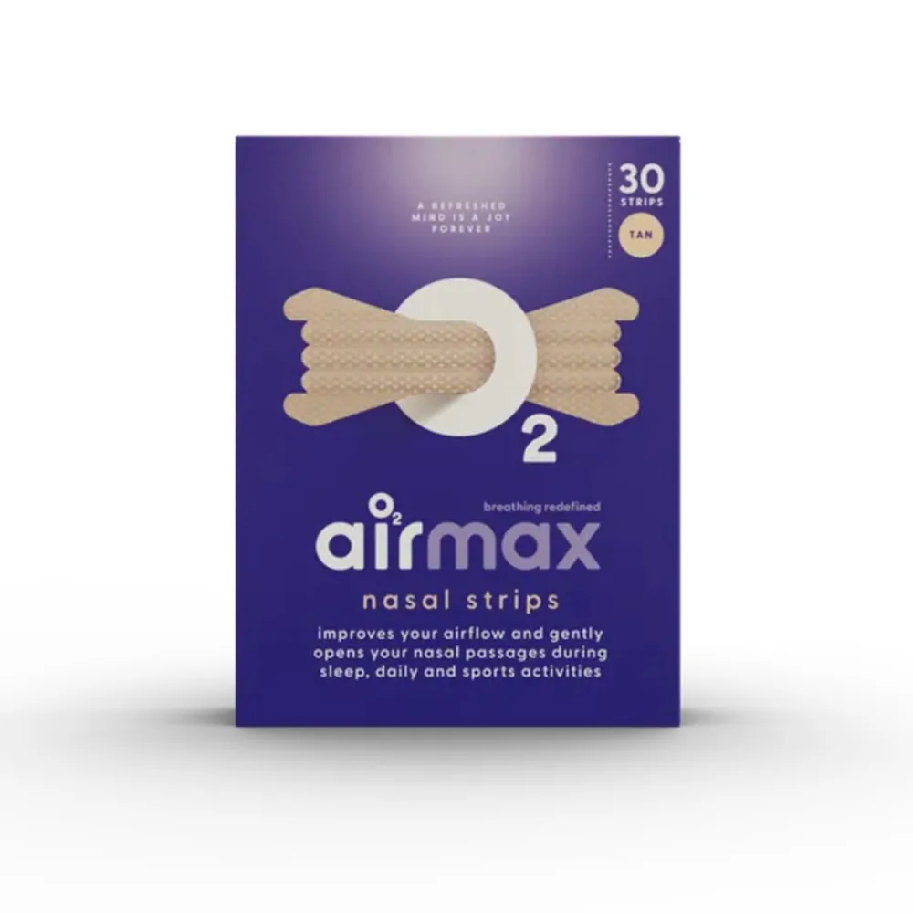 Airmax Neusstrips Tan zijn ontwikkeld om de neusademhaling direct te verbeteren. Dankzij drie buigzame baleinen en een huidvriendelijke kleefstrip trekken ze de neusvleugels zachtjes open. Dit vergemakkelijkt de luchtstroom, waardoor je beter kunt ademhalen tijdens het slapen of bij een verstopte neus door verkoudheid of hooikoorts. De neusstrips kunnen snurken verminderen of zelfs stoppen en dragen bij aan een betere nachtrust. Geschikt voor dagelijks gebruik en ideaal bij ademhalingsproblemen. Dit product is een medisch hulpmiddel.