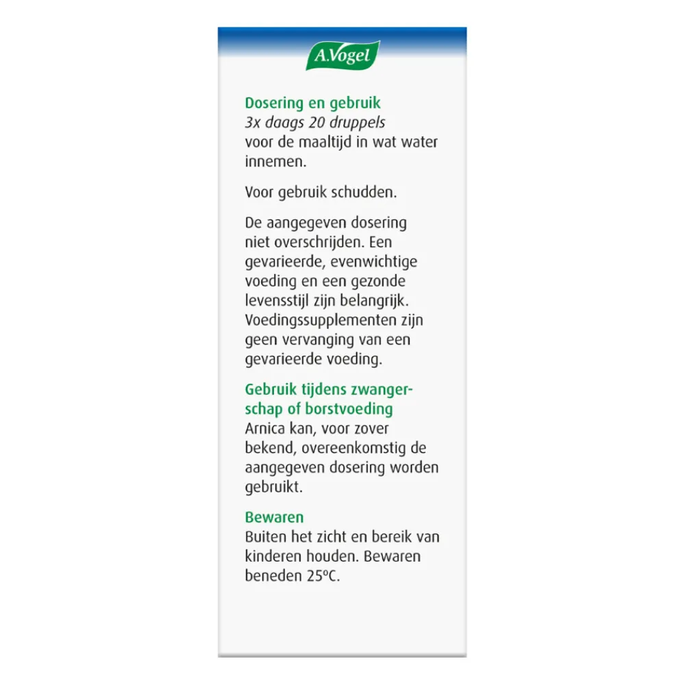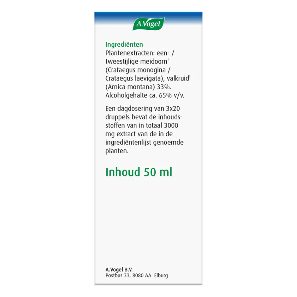 A.Vogel Arnica complex is een voedingssupplement met Arnica montana (valkruid) en Crataegus monogyna (meidoorn). De druppels hebben een gunstige invloed op de bloedsomloop* in het lichaam. Een goede en natuurlijke bloedsomloop zorgt ervoor dat alle weefsels in het lichaam worden voorzien van zuurstof en voedingsstoffen en dat alle afvalstoffen op het juiste moment worden afgevoerd, zodat de weefsels goed kunnen blijven functioneren. Crataegus heeft een gunstige invloed op het hart*.