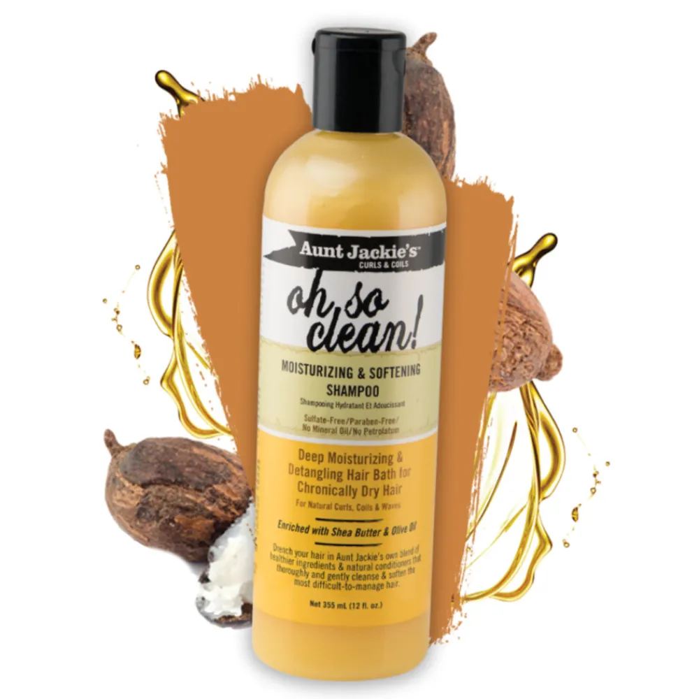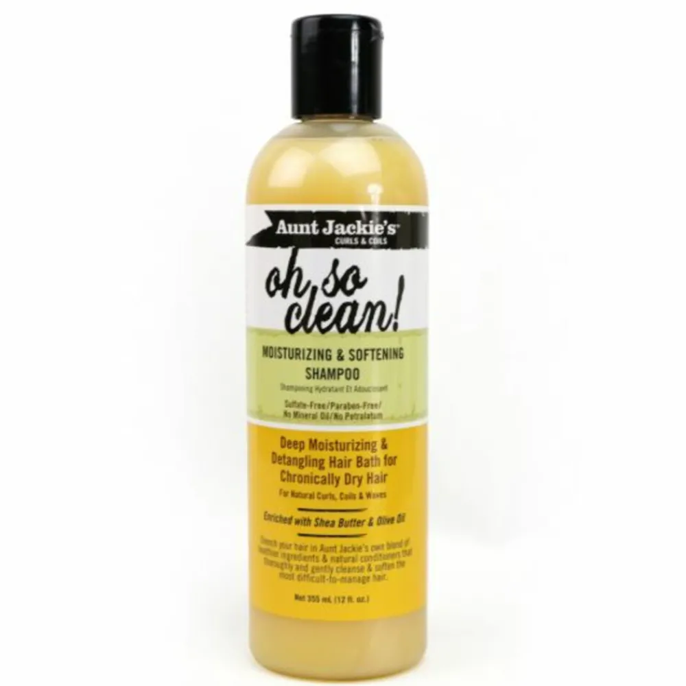 Gun je droge haar een diep hydraterend en verfrissend haarbad met Aunt Jackie’s Oh So Clean! Shampoo. Deze intens schuimende clarifying shampoo reinigt je haar grondig, verwijdert productresten en onzuiverheden, en laat je lokken superzacht en makkelijk doorkambaar achter. Verrijkt met voedende kokosolie, sheaboter en extra vierge olijfolie, hydrateert en verzacht het je haar zonder uit te drogen. Perfect voor krullend en droog haar, deze shampoo helpt ook krimp te verminderen en kan het beste periodiek worden gebruikt voor een frisse, schone start. Dit product is vrij van sulfaten, parabenen en minerale oliën.