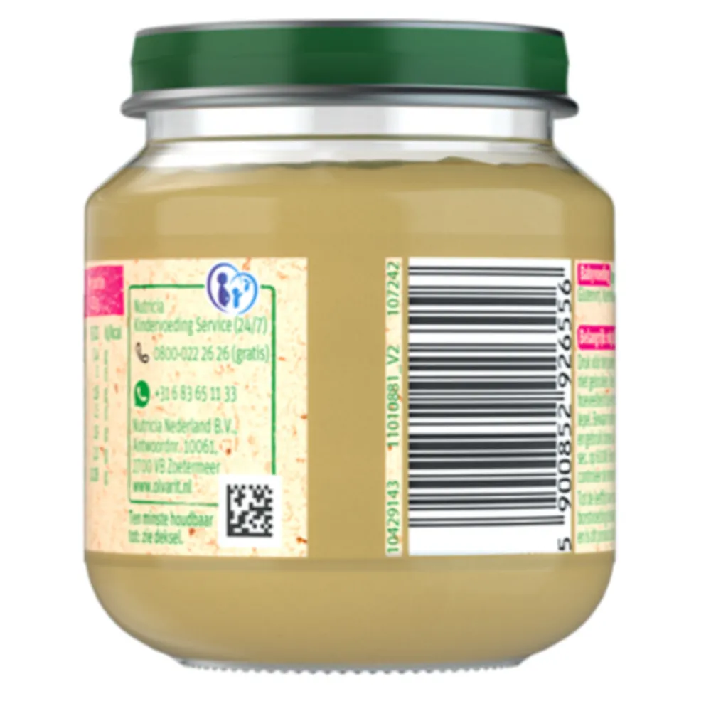 Olvarit groentehapje 4m kun je geven tot de leeftijd van 6 maanden, daarna stap je over naar de 6m potjes. Smaakontwikkeling zorgt ervoor dat je kindje, door veel te proeven, went aan verschillende smaakjes. Wat je kind nu eet en leert eten, is bepalend voor de rest van zijn leven. Vanaf 12 maanden worden kinderen steeds kritischer als het om eten gaat en krijgen ze steeds meer een uitgesproken smaak. Daarom is het belangrijk om je kind al voor de leeftijd van 1 jaar te stimuleren met zo veel mogelijk uiteenlopende gerechten. Je kindje moet een nieuwe smaak wel 5 tot 10 keer proeven voordat hij er echt aan gewend is. Dus geef het niet op als je kind iets de eerste keer niet lust. Blijf het proberen! Wissel verschillende smaken fruit en groente zoveel mogelijk af. Het Olvarit assortiment bevat meer dan 100 soorten fruit en maaltijden.