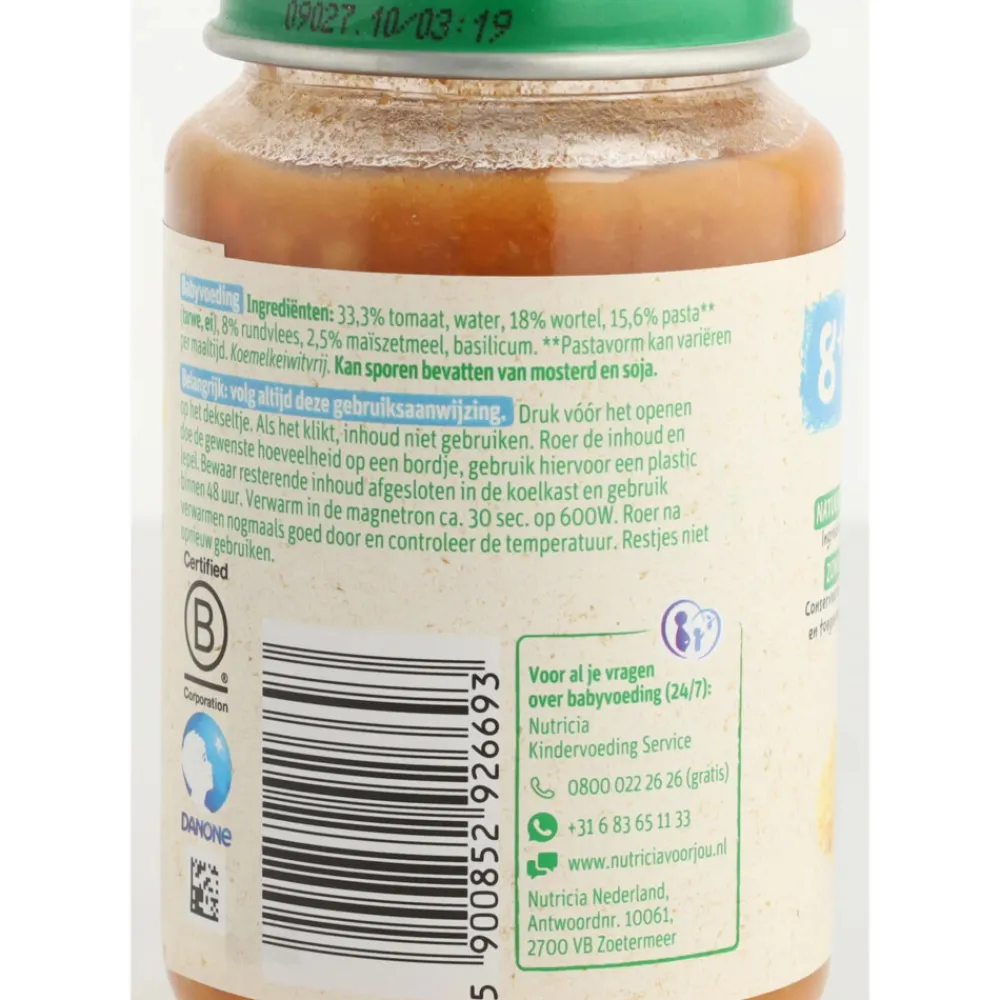 Deze maaltijd is speciaal geschikt voor kindjes vanaf 8 maanden. Nu altijd met een herkenbare groente smaak, dit helpt je kindje de smaak te herkennen en te waarderen. Met de herkenbare smaak van tomaat. De smaak en textuur zijn aangepast op de leeftijd van je kindje om een goede smaakontwikkeling te ondersteunen.