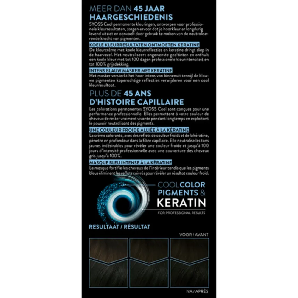 SYOSS permanente haarkleuringen, ontworpen voor professionele resultaten, zorgen ervoor dat je haarkleur er langdurig levend uitziet en aanvoelt. De kleurcrème, met rijke kleurpigmenten en keratine, dringt diep in de haarvezel om tot 100 dagen professionele kleurintensiteit en tot 100 % grijsdekking te garanderen. Het intens verzorgend masker met keratine versterkt het haar intens van binnenuit en maakt het haaroppervlak glad: de kleurpigmenten worden goed vastgelegd en onthullen de levendigste en rijkste kleuren van SYOSS.