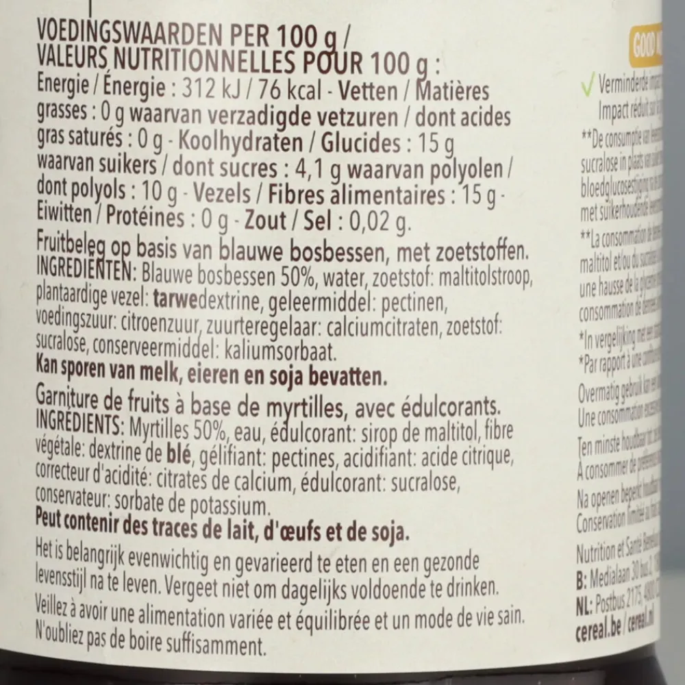 Blauwe bosbessen 50%, water, tarwedextrine, zoetstoffen: maltitolstroop en sucralose, geleermiddel: pectinen, zuurteregelaars: citroenzuur en calciumcitraten, conserveermiddel: kaliumsorbaat.