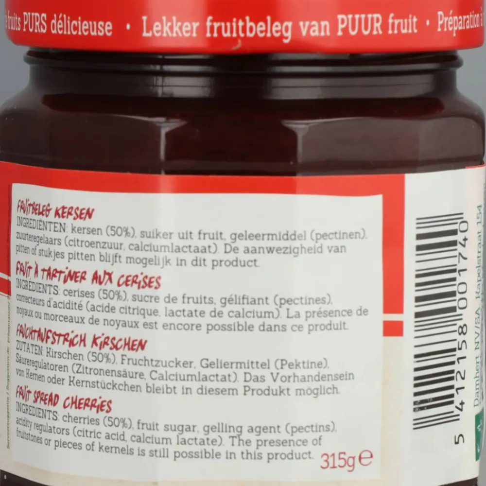 kersen(50%), suiker uit fruit, geleermiddel (pectinen), zuurteregelaars (citroenzuur, calciumlactaat).