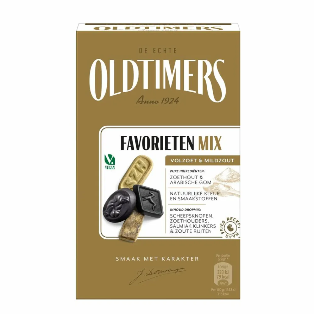 Oldtimers Favorieten Mix bestaat uit Zoetwaterzeilers (volzoet & zacht), Zoethoudertjes (volzoet & zacht), Salmiak Klinkers (zwart-wit & stevig) en Hindelooper Ruitjesdrop (mildzout & stevig). Met alleen natuurlijke kleur- en smaakstoffen. Gelatine- en glutenvrij.