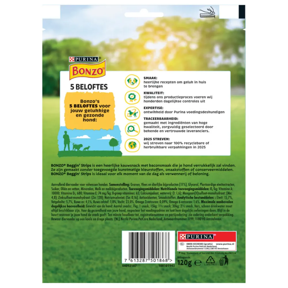 Bonzo Beggin Strips is een heerlijke kauwsnack met baconsmaak die je hond verrukkelijk zal vinden. Bonzo Beginn Strips is ideaal voor elk moment van de dag als verwennerij of beloning. Een hap van deze lekkere snack zal je hond al blij maken.