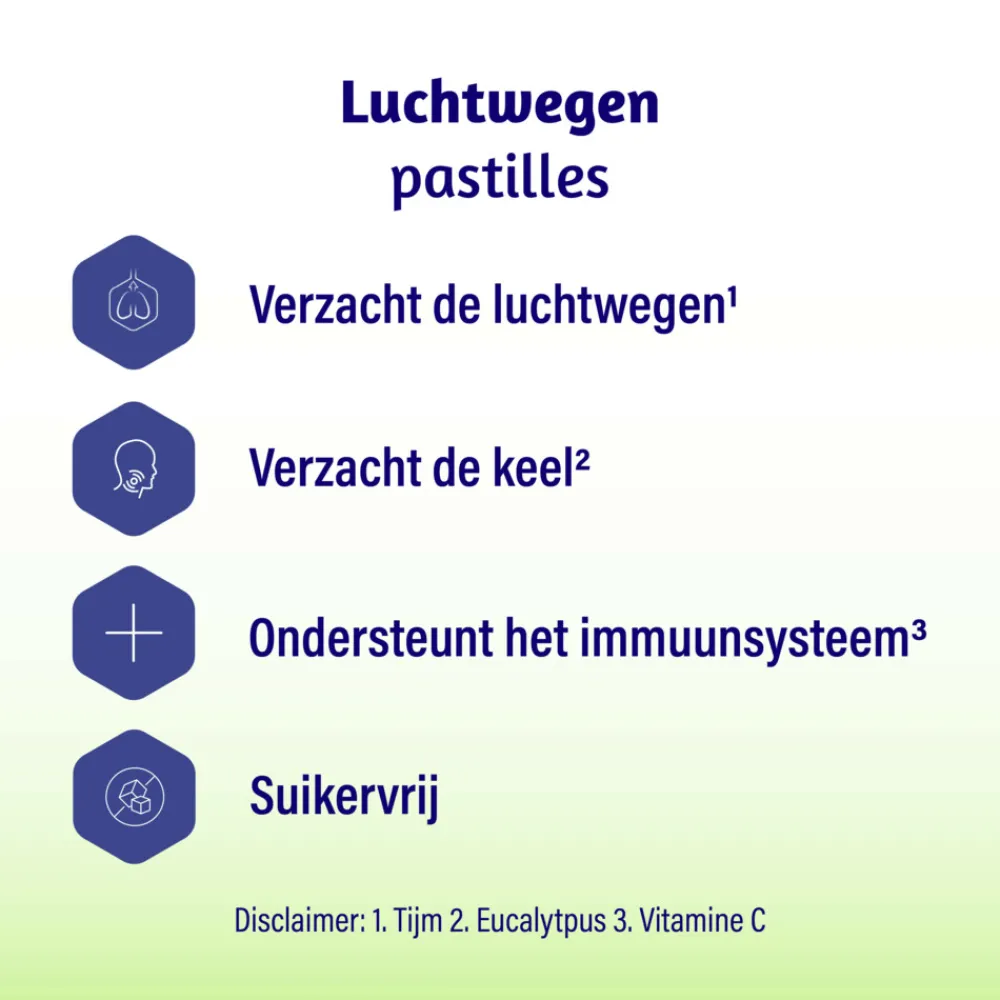 Dampo Luchtwegen pastilles verzachten de luchtwegen1* en keel2*. Tevens ondersteunt Vitamine C het immuunsysteem. De pastilles zijn suikervrij.1) Tijm2) Eucalyptus* Gezondheidsclaim in afwachting van Europese toelating