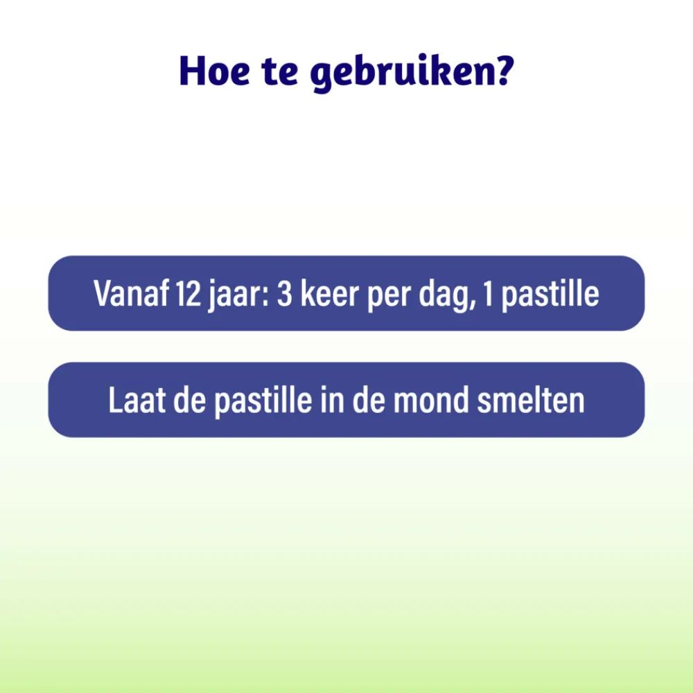 Laat de pastille langzaam in de mond smelten. De aanbevolen dosering niet overschrijven. Geschikt vanaf 12 jaar. Dit product wordt niet aanbevolen voor gebruik tijdens zwangerschap.