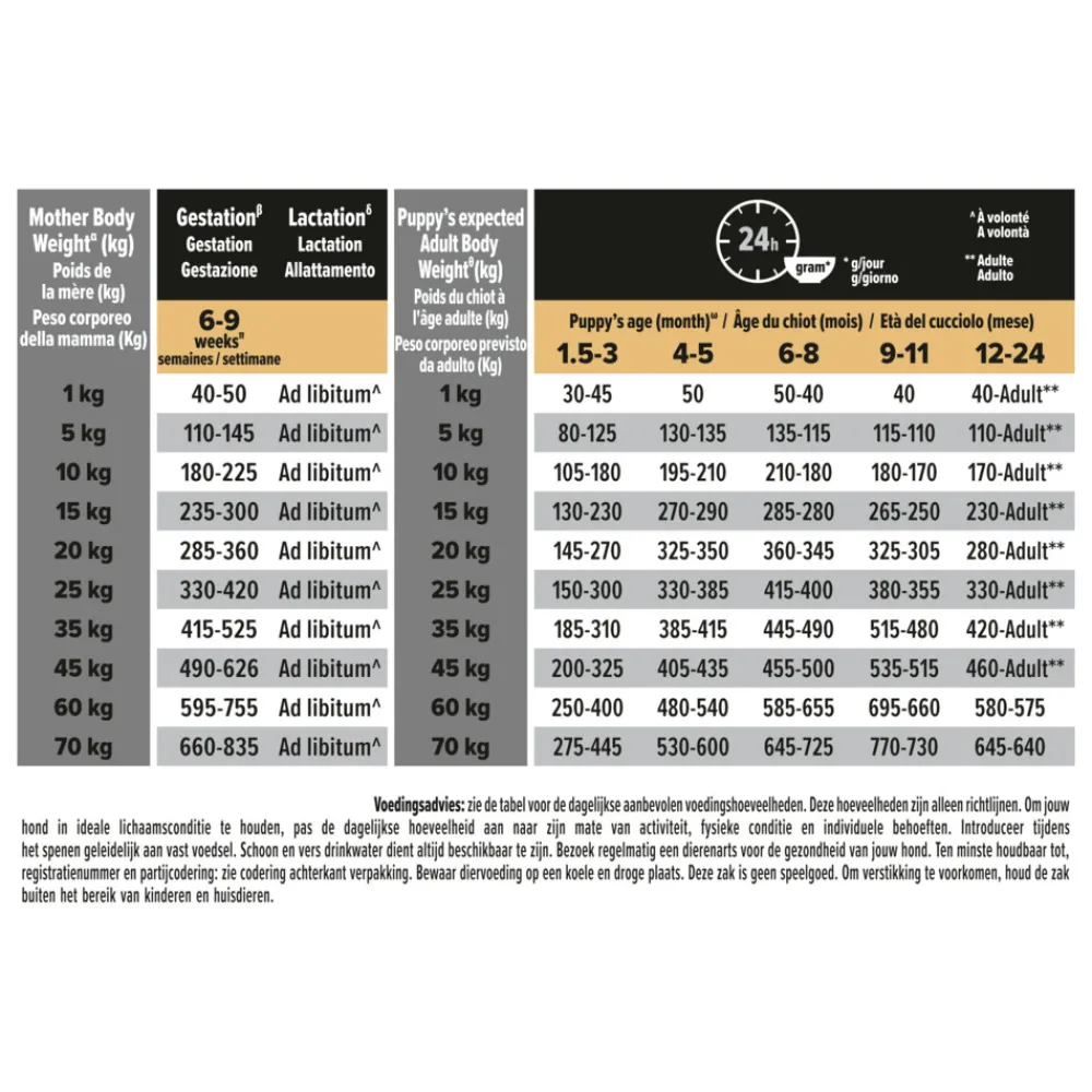 Voeden tijdens het spenen en de groei: tijdens de 3 tot 6 weken van het spenen kan je beginnen met het geven van bevochtigde Pro Plan®Puppy brokken, 3 tot 4 keer per dag. Voed na het spenen volgens de voedingstabel. Verminder geleidelijk aan het vochtig maken van de brokken na de leeftijd van 3 maanden. Het behouden van een slanke lichaamsconditie tijdens de groei is belangrijk voor een gezonde ontwikkeling. Naar gelang de mate van activiteit, fysiekeconditieen individuele behoeften van je puppy, kan je de dagelijkse hoeveelheid aanpassen.