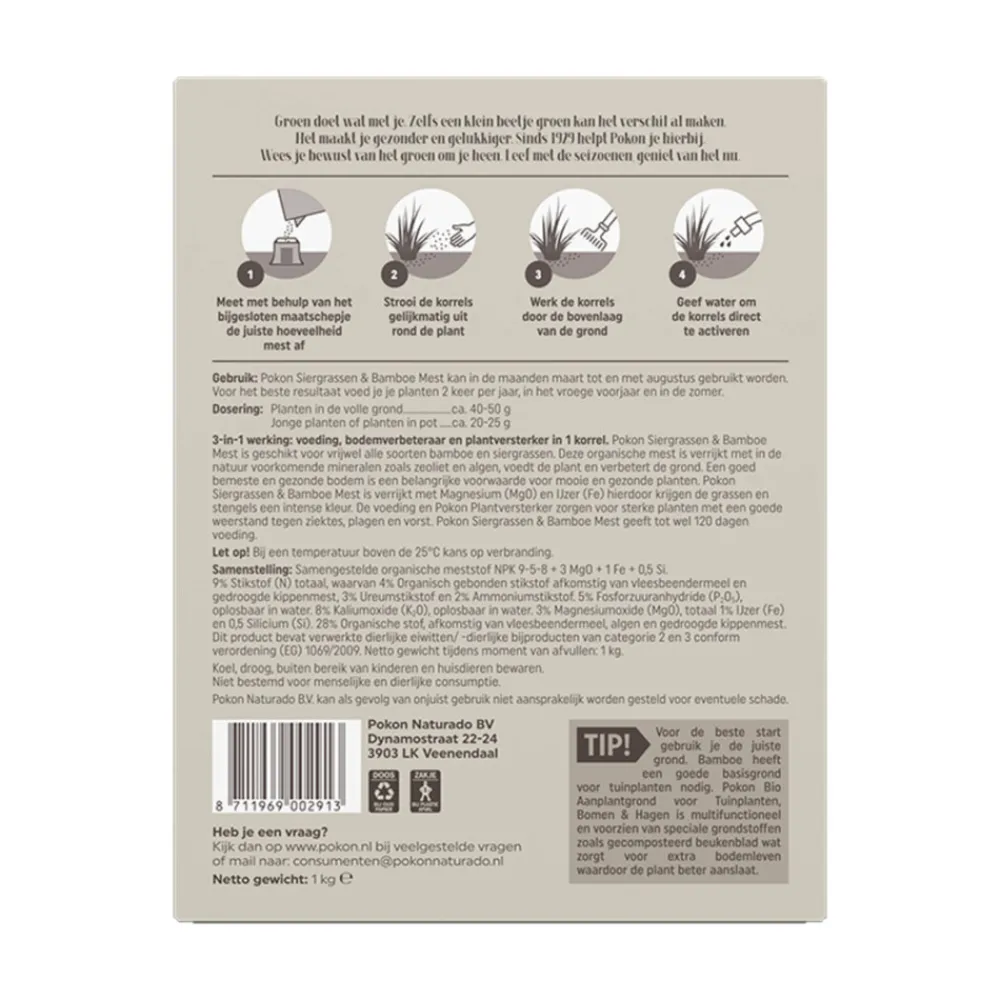 Pokon Siergrassen & Bamboe Mest biedt een complete verzorging voor siergrassen en bamboe met een 3-in-1 werking: voeding, bodemverbeteraar en plantversterker in één korrel. De organische mest, verrijkt met natuurlijke mineralen zoals zeoliet en algen, voedt de planten en verbetert de grond. Magnesium en ijzer zorgen voor intense kleuren en sterke stengels. Dankzij de plantenversterker ontwikkelen de grassen een hoge weerstand tegen ziektes, plagen en vorst. De mest werkt tot 120 dagen en is eenvoudig toe te passen van maart tot en met augustus.