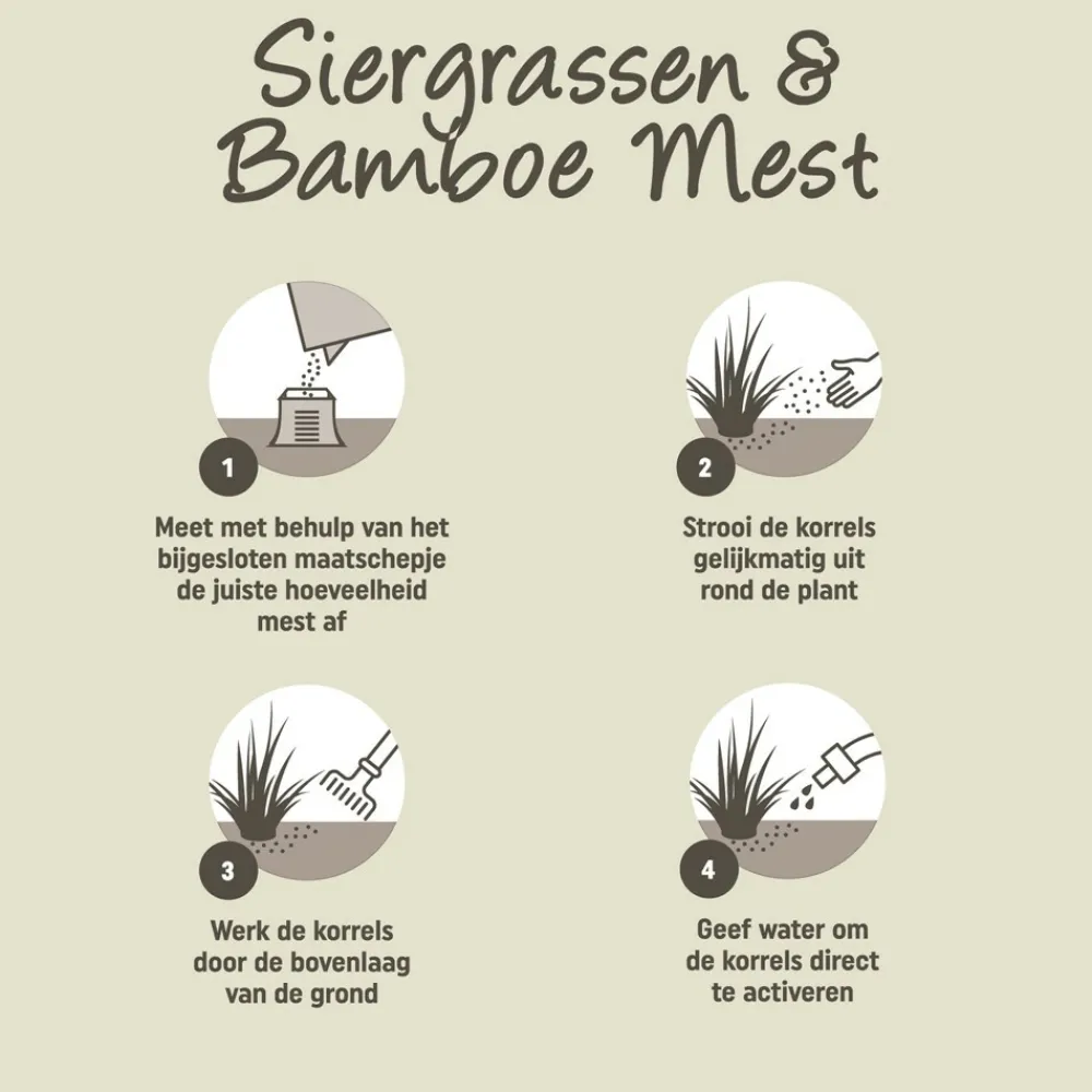 Meet met behulp van het bijgesloten maatschepje de juiste hoeveelheid mest af. Strooi de korrels gelijkmatig uit rond de plant. Werk de korrels door de bovenlaag van de grond. Geef water om de korrels direct te activeren.