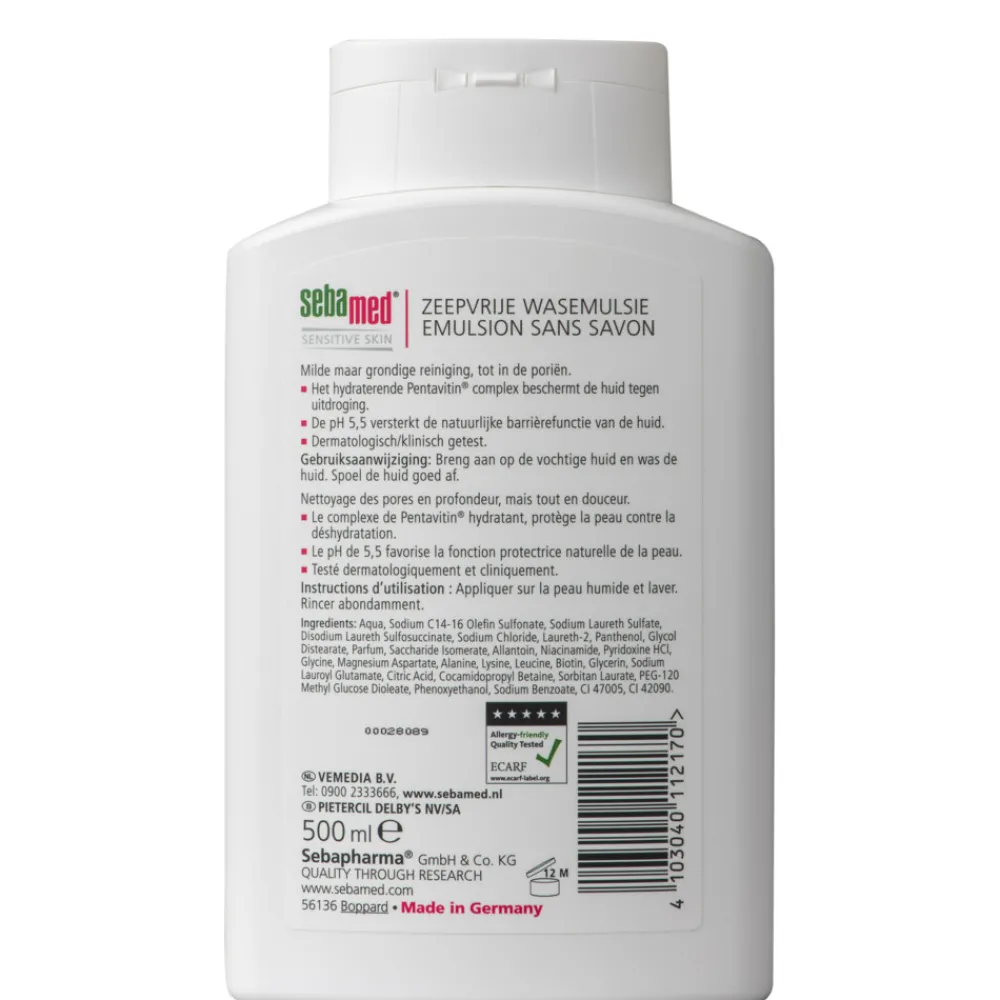 Sebamed Zeepvrije Wasemulsie is speciaal ontwikkeld voor het dagelijks wassen van handen, gezicht én lichaam. Dus ook perfect voor onder de douche. De milde, wasactieve bestanddelen in de Zeepvrije Wasemulsie reinigen de huid zeer grondig, terwijl Pentavitin de huid beschermt tegen uitdroging. De huid voelt merkbaar zacht en soepel aan. De huidneutrale pH-waarde van 5,5 versterkt de natuurlijke bescherming laag van de huid. Zo blijft de huid gezond en in topconditie. Ontwikkelt door en met dermatologen.