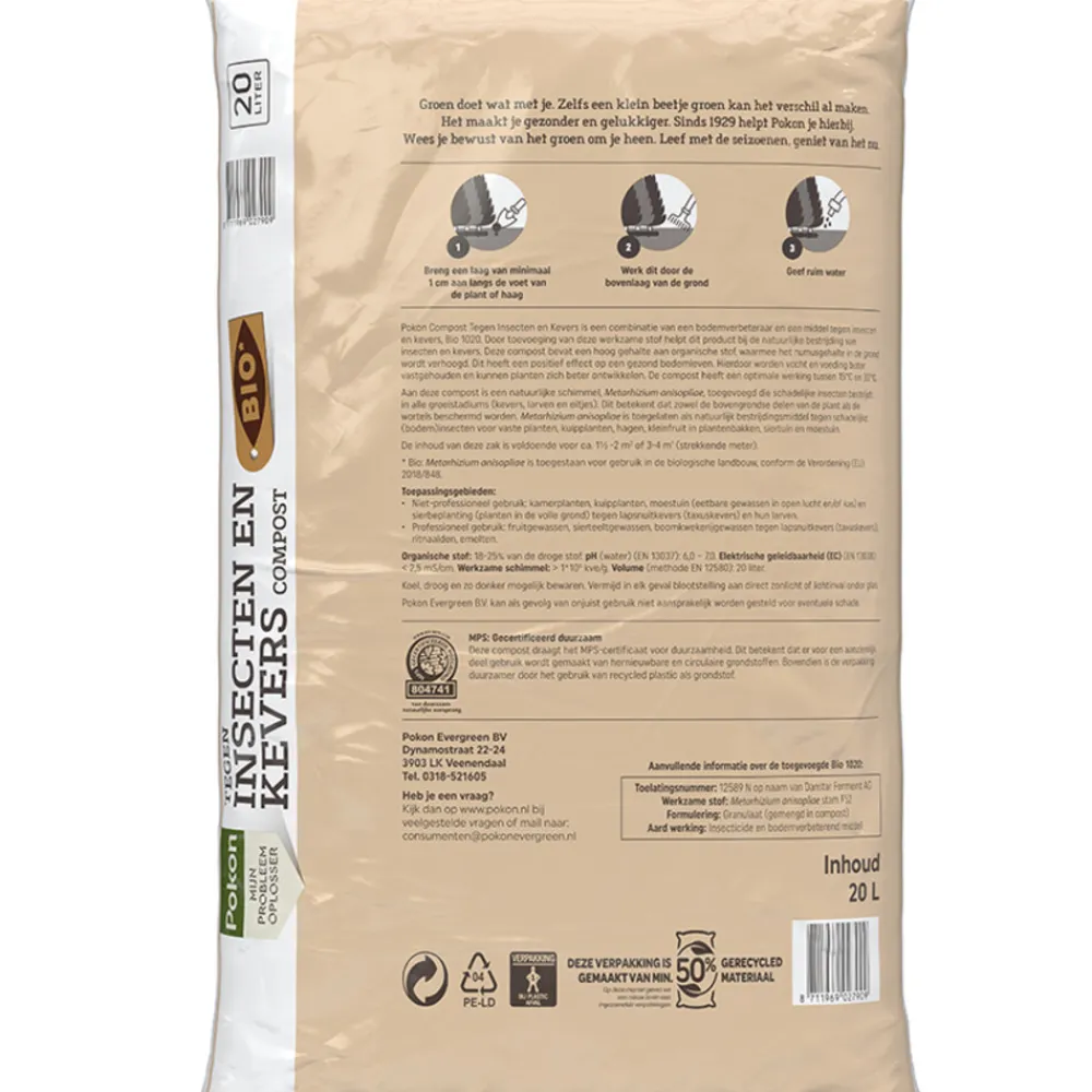 Pokon Bio Tegen Insecten en Kevers biedt een natuurlijke oplossing voor het bestrijden van schadelijke insecten en kevers. Deze compost bevat een hoog gehalte aan organische stof, wat het humusgehalte in de grond verhoogt. Hierdoor wordt het bodemleven verbeterd, kunnen planten zich beter ontwikkelen en wordt vocht en voeding beter vastgehouden. De compost bevat de natuurlijke schimmel Metarhizium anisopliae, die effectief schadelijke insecten, kevers, larven en eitjes bestrijdt in alle groeistadia. Deze schimmel beschermt zowel de wortels als de bovengrondse delen van je planten. Pokon Bio Tegen Insecten en Kevers is MPS-gecertificeerd, wat duidt op duurzaamheid en het gebruik van hernieuwbare grondstoffen.
