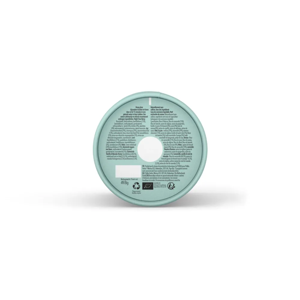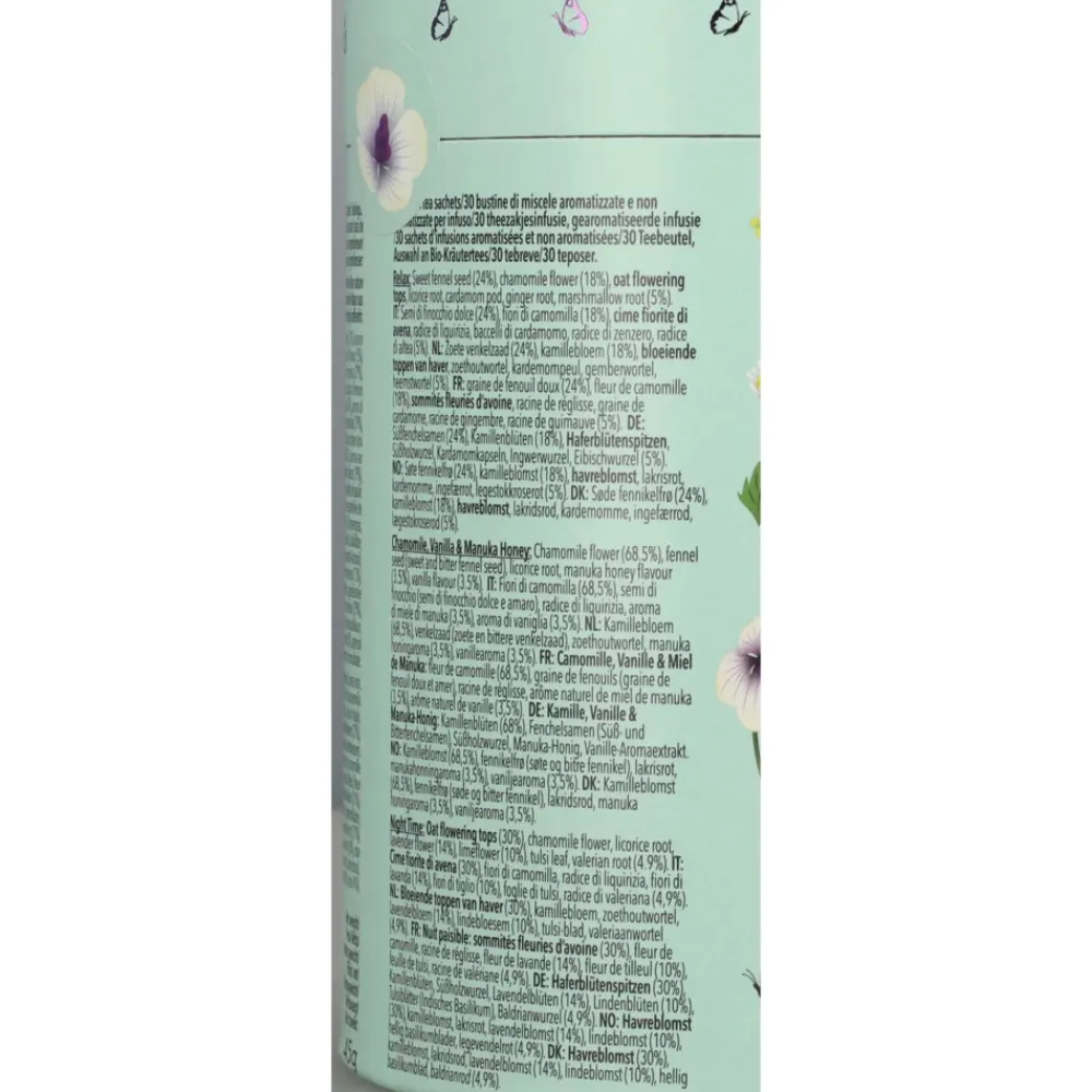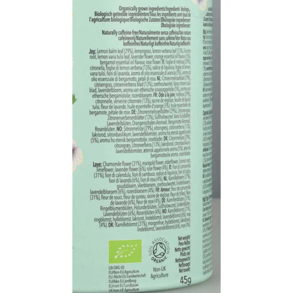 Natuurlijk cafeïnevrij en ethisch geproduceerd, biologisch Ingrediënten: Joy: Citroenmelisseblad (29%), citroengras (29%), citroenverbenablad (13%), zoethoutwortel, citroenvana tulsiblad (5%), lavendelbloem, sinaasappel aroma van etherische olie (5%), aroma van etherische olie van bergamot, rozenbloem. Night Time Berry: Rozenbottel, hibiscusbloem, kamillebloem (15%), lavendelbloem, zoethoutwortel, gemberwortel, echinaceablad en -wortel (6%), vlierbes (4%), zwarte bessenfruit (4%), valeriaanwortel, bosbessensmaak, zwarte bessensmaak. Relax: Zoet venkelzaad (24%), kamillebloem (18%), haverbloeiende toppen, zoethoutwortel, kardemompeul, gemberwortel, heemstwortel (5%). Peace: Kamillebloem, groene muntblad (36%), zoethoutwortel, lavendelbloem, ashwagandhawortel (5%), hennepzaadoliekorrels (4%). Chamomile Vanilla & Manuka Honey: Kamillebloem (68,5%), venkelzaad (zoete en bittere venkelzaad), zoethoutwortel, manukahoningaroma (3,5%), vanillearoma (3,5%).