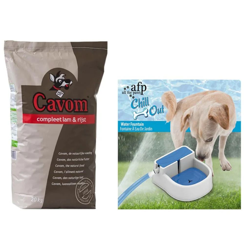 Verwen je hond met dit heerlijke pakket! Het pakket bestaat uit de complete hondenvoeding van Cavom in de smaak lam & rijst (speciaal voor gevoelige honden) en de fantastische automatische waterbak van Afp.