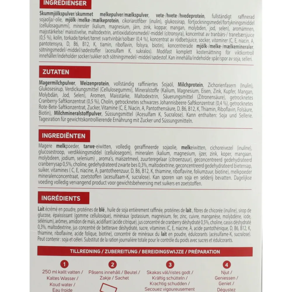 Glucosestroop, MELKEIWITTEN, Magere MELKPOEDER, Inuline, TARWE-eiwitten (gluten), SOJAOLIE, Mineralen (Kalium, Natrium, Magnesium, Fosfor, IJzer, Zink, Jood, Koper, Seleen, Mangaan), Zonnebloemolie, Verdikkingsmiddel: Natriumcarboxymethylcellulose, Cranberryvlokken 1,1% (Cranberry, Tapiocazetmeel, Maltodextrine, Voedingszuur: Citroenzuur, Natuurlijk aroma), Voedingszuur: Citroenzuur, Natuurlijke aroma’s, Cassispoeder 0,5% (Cassis, Suiker, Maiszetmeel), Kleurstof: Bietenrood, Emulgatoren: SOJALECITHINEN, Citroenzuuresters van Mono- en Diglyceriden van verzuren, Aroma, Vitaminen (C, E, Niacine, A, Pantotheenzuur, B1, D, B6, B2, Foliumzuur, B12, Biotine), Zoetstoffen: Acesulfaam-K, Sucralose, Antioxidanten: Vetzuuresters van citroenzuur, Tocoferolrijk extract, Ascorbinezuur.