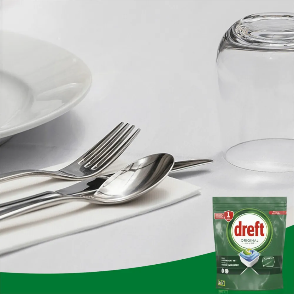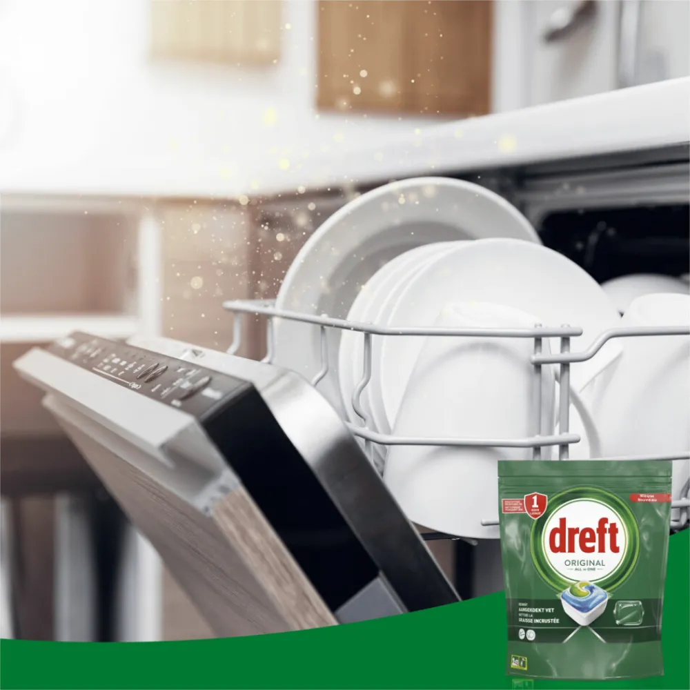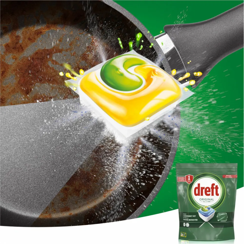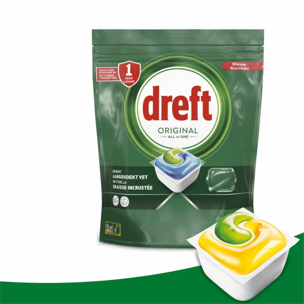 Dreft Original All in One vaatwastabletten leveren direct een grondige reinigingsactie en zijn zelfs effectief op aangekoekt vet, voor een sprankelend schone vaat. Dreft combineert vloeistof en poeder in één krachtige capsule. Het ultra-oplosbare zakje lost snel op, zodat het snel begint te reinigen om de klus klaar te krijgen. En ze zijn gemakkelijk te gebruiken. Plaats ze gewoon in het doseerbakje van je vaatwasser, met verpakking.