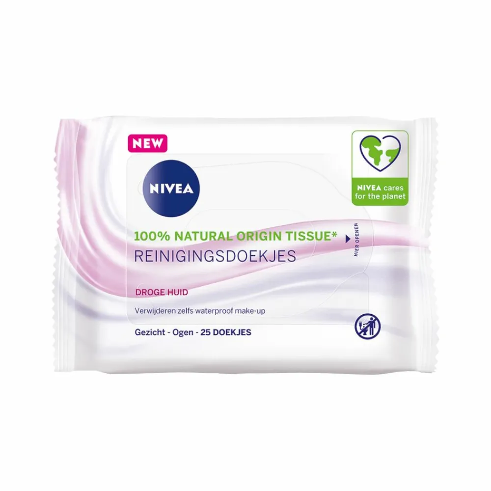 Nivea 3-in1 Zachte Reinigingsdoekjes voor de droge huid verwijderen doeltreffend zelfs waterproof make-up en mascara, zodat je huid grondig gereinigd en verfrist wordt. Huidvriendelijkheid dermatologisch en oftalmologisch goedgekeurd. Reinigingsdoekjes van natuurlijke oorsprong*.*Ingrediënten afkomstig uit de natuur die na verwerking meer dan 50% van hun natuurlijke staat behouden, inclusief water.