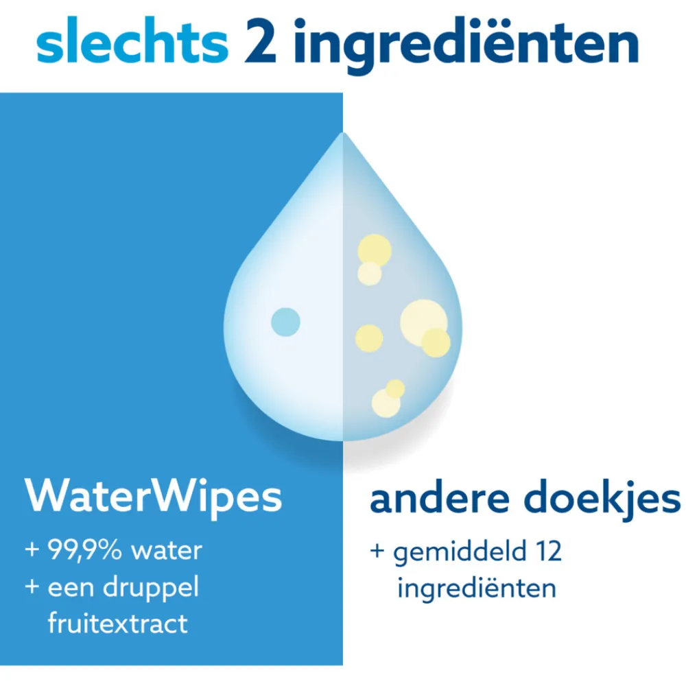 WaterWipes zijn de enige babydoekjes zonder parfum, geurstoffen en andere chemicaliën. Dat maakt ze zeer geschikt voor de gevoelige babyhuid. De babydoekjes bestaan uit 99,9% water en een druppel fruitextract. Ook zijn ze 100% plasticvrij en biologisch afbreekbaar. Het beste voor je baby én de aarde!