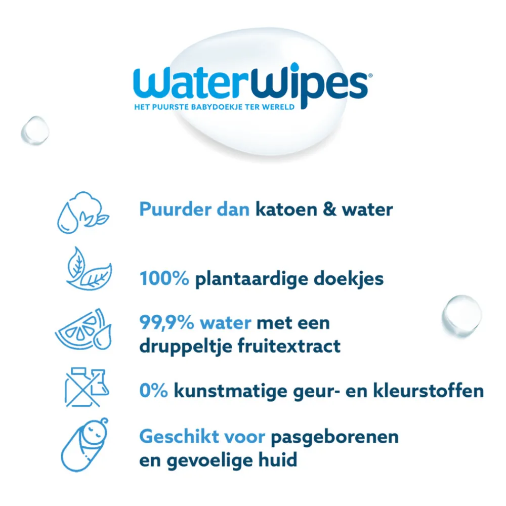 WaterWipes zijn de enige billendoekjes die alleen 99.9% water en een druppeltje fruitextract bevatten én plasticvrij zijn. We zijn dan ook het meest aanbevolen babydoekjes merk door kraamverzorgenden in Nederland. Nog steeds even puur en vriendelijk voor zelfs de meest gevoelige huid, maar nu vriendelijker voor het milieu.