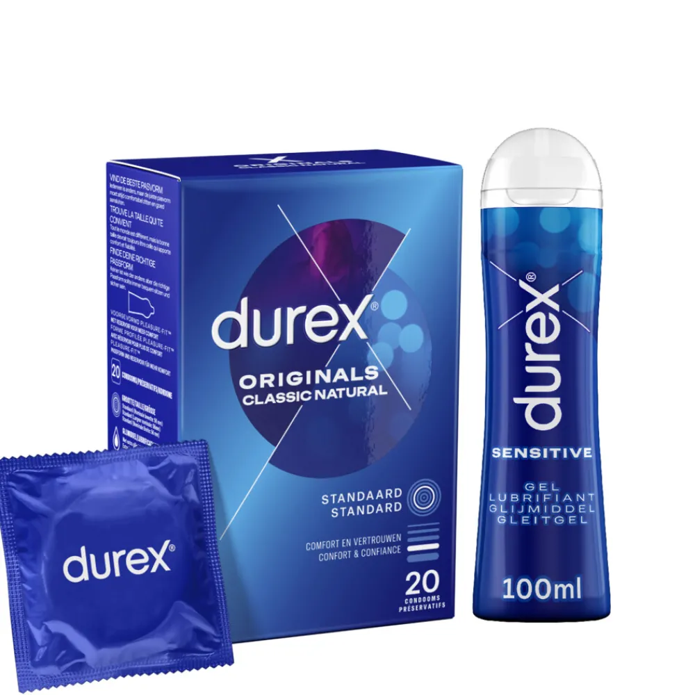 Iedereen is anders, maar de juiste pasvorm moet altijd comfortabel en veilig zijn. Durex Originals Classic Natural condooms zijn de originele Durex-condooms, betrouwbaar als altijd. De condooms zijn gemaakt van transparant, natuurlijk rubber latex en hebben een prettige geur. De Pleasure-FitTM pasvorm met reservoir is speciaal gevormd voor meer comfort.De Durex Play Sensitive glijmiddel is op waterbasis wat het plezier verhoogt. Het glijmiddel voelt niet vet of plakkerig aan en is licht en zacht. Play Feel glijmiddel geeft je een intense ervaring, of je het nu gebruikt voor vaginale, anale of orale seks. Het glijmiddel vermindert vaginale droogheid en ander intiem ongemak.