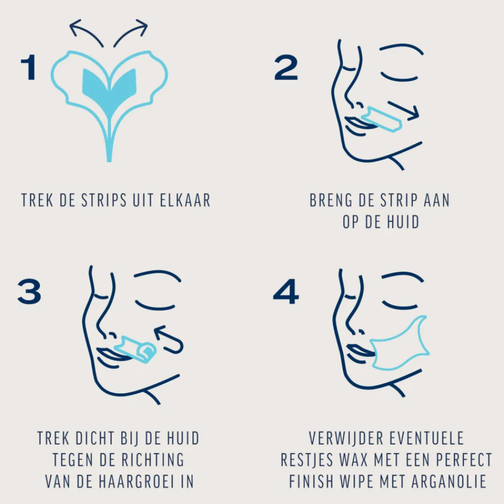 ZORG ERVOOR DAT DE HUID VOOR DE WAXBEURT SCHOON EN DROOG IS. JE KUNT DEZELFDE STRIP BLIJVEN GEBRUIKEN TOT HIJ NIET MEER KLEEFT. Niet meer nodig om de strips tegen elkaar te wrijven om ze uit elkaar te halen! Je krijgt geweldige resultaten in slechts 4 eenvoudige stappen: