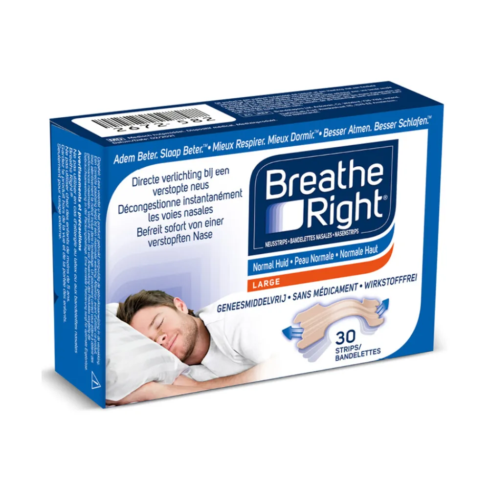 Medisch hulpmiddel Breathe Right is een transparante, wereldwijd gepatenteerde neusstrip die helpt om tijdens de slaap vrijer door de neus te ademen. Ideaal als je neus verstopt zit of als je snurkt. De neusstrips zijn gemaakt van flexibele, veerachtige banden die precies boven de neusgaten passen. Doordat de twee vleugels proberen terug te keren naar hun oorspronkelijke vorm, heffen ze de zijkanten van de neus op en openen ze de neusholtes waardoor je meer lucht door de neus binnenkrijgt.