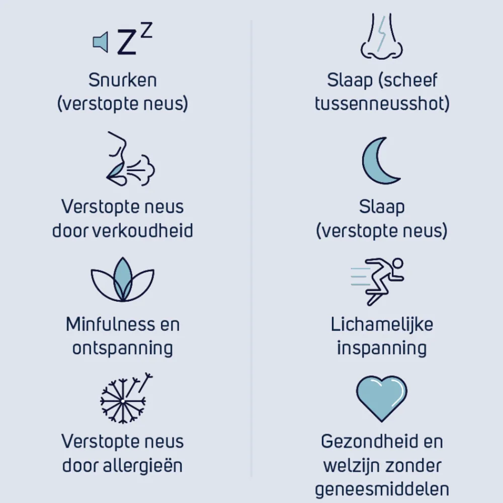 De twee buigzame delen trekken de neusvleugels zachtjes open waardoor je meer lucht krijgt (tot 31% meer!). Hierdoor kan het snurken aanzienlijk verminderen of zelfs verdwijnen.