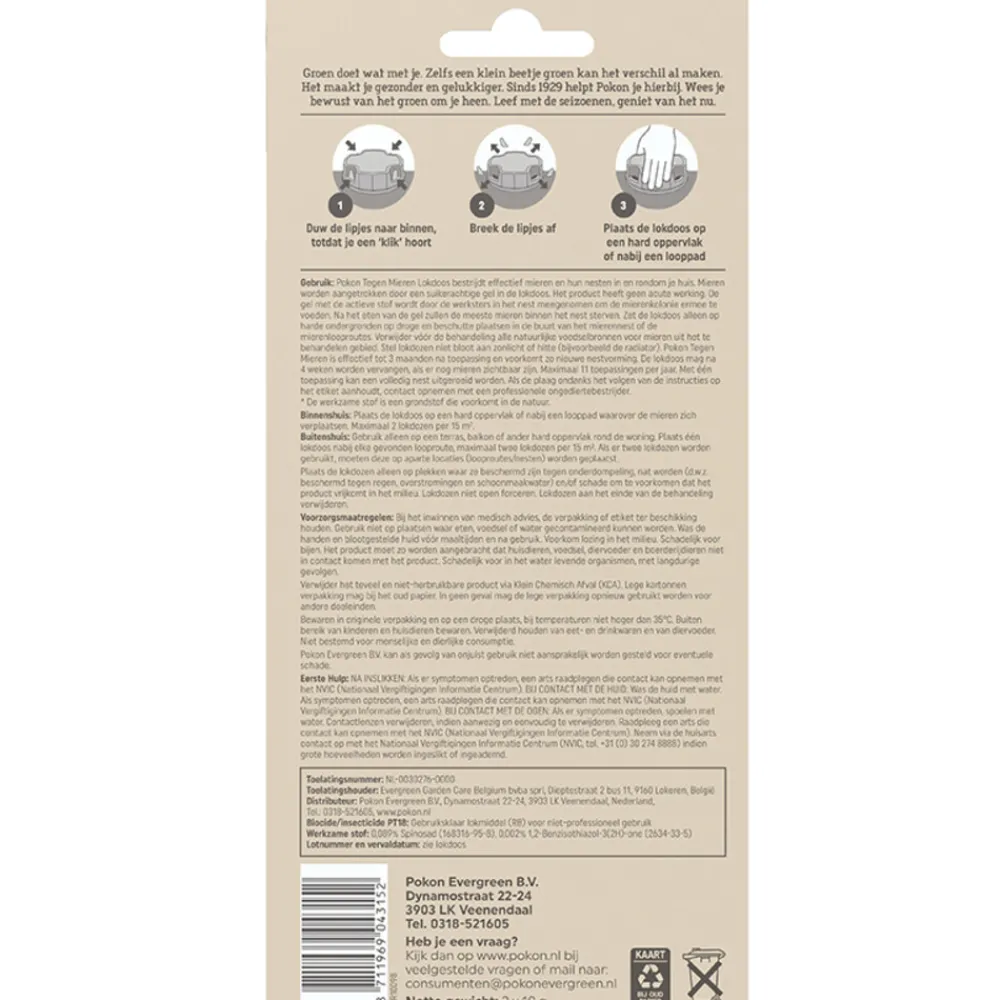 Pokon Tegen Mieren Lokdoos helpt je om mieren effectief te bestrijden, zowel binnen als buiten. De lokdoos bevat een speciale suikerachtige gel die mieren aantrekt. De werksters nemen de gel mee naar het nest en voeden de kolonie ermee. Hierdoor wordt niet alleen de mier die de gel eet, maar ook het hele nest bestreden. De werking houdt tot wel 4 weken aan, zodat je langdurig van mieren verlost bent. Plaats de lokdoos eenvoudig op plekken waar je mieren ziet lopen, zoals in huis, op het terras of in de tuin.