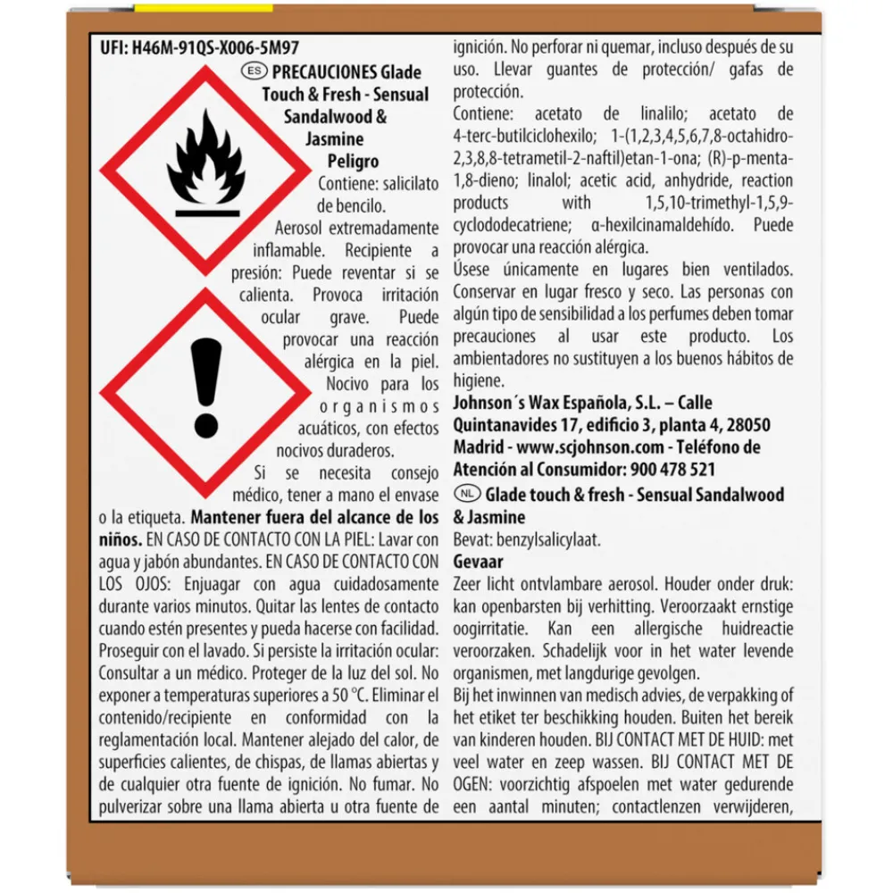 Glade Touch & Fresh Sensual Sandalwood & Jasmine voordeelpak verspreidt een comfortabele geur van warme amber, sandelhout, bergamot en jasmijn.