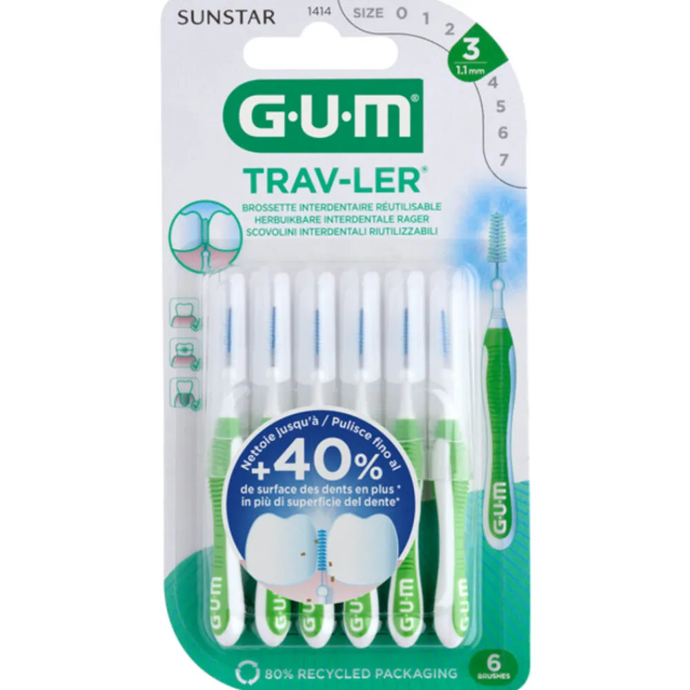 Gebruik de GUM Trav-Ler ragers Groen 1,1 mm voor het reinigen tussen tanden en kiezen. De GUM Trav-Ler ragers zorgen voor een optimale plaqueverwijdering dankzij de driehoekig gevormde borstelharen. De ragers zijn gecoat met chloorhexidine om de rager tot 14 dagen antibacterieel te houden.