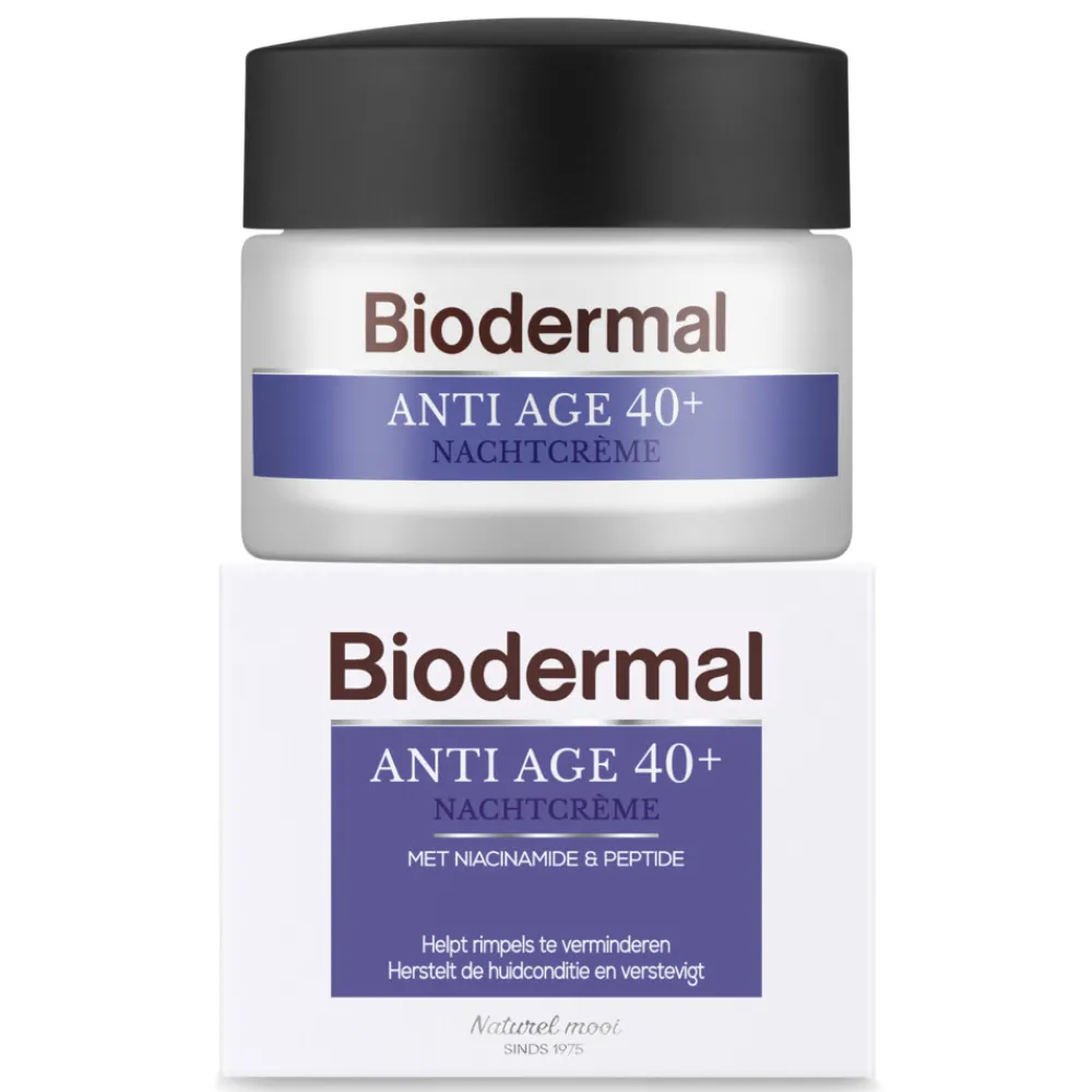 Met de jaren ontstaan er rimpels en verliest de huid aan elasticiteit. Biodermal Anti Age 40+ nachtcrème vermindert rimpels en verstevigt de verslapte huid van het gezicht en hals intensief. Daarnaast zorgt het voor een optimaal herstel en voeding van de huid. De unieke samenstelling werkt diepgaand en zorgt voor een stevige, strakke en gezonde huid. Aanbevolen leeftijd vanaf 40 jaar.