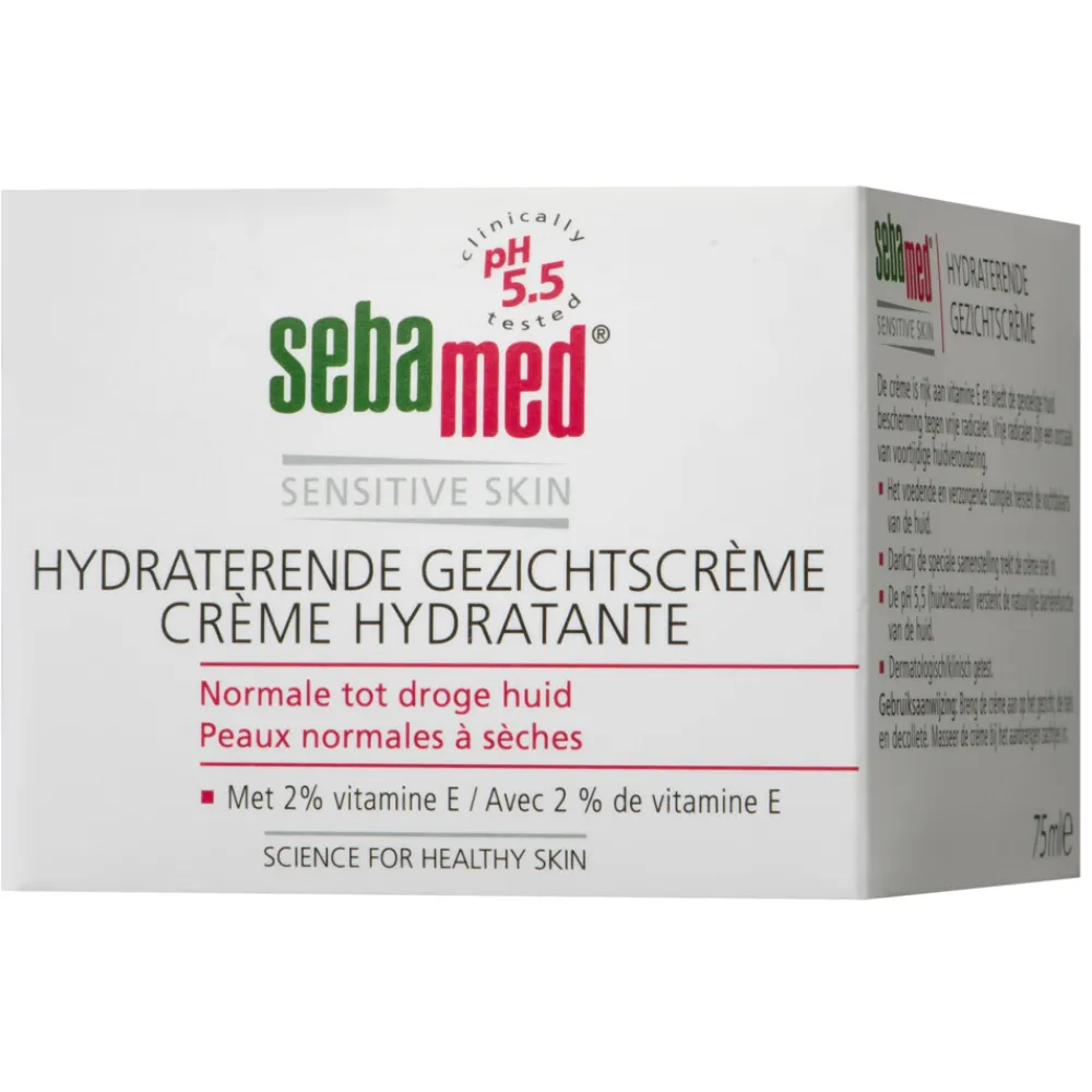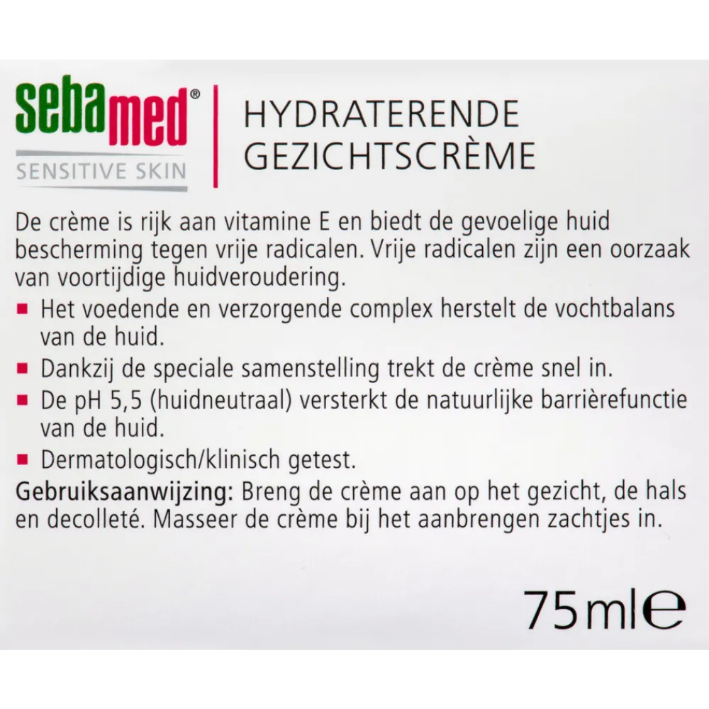 Sebamed Hydraterende gezichtscrème is rijk aan vitamine E en biedt de normale tot droge huid bescherming tegen vrije radicalen. Vrije radicalen zijn een oorzaak van voortijdige huidveroudering. De voedende en verzorgende samenstelling herstelt de vochtbalans van de huid. En dankzij de speciale samenstelling trekt de crème snel in. De huid neutrale pH-waarde van 5,5 versterkt de natuurlijke bescherming laag van de huid. Zo blijft de huid gezond en in topconditie. Ontwikkelt door en met dermatologen.