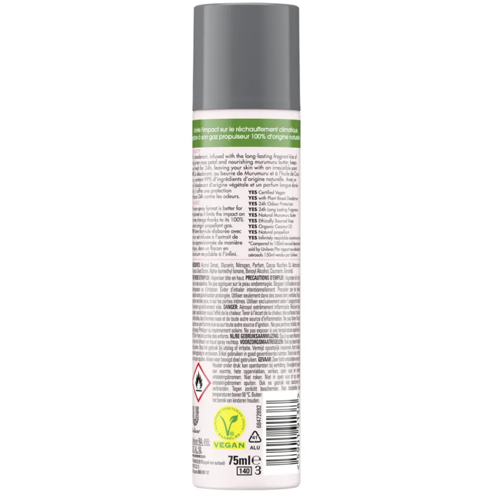 De Eco-spray is verrijkt met Bulgaarse rozenblaadjes en voedende muru muru butter voor een onweerstaanbare geur. Doordat er gebruik wordt gemaakt van 100% natuurlijke drijfgas, is deze deodorant beter voor de planeet. Bovendien is de Eco-spray vegan en zit deze in een recyclebare aluminium verpakking.