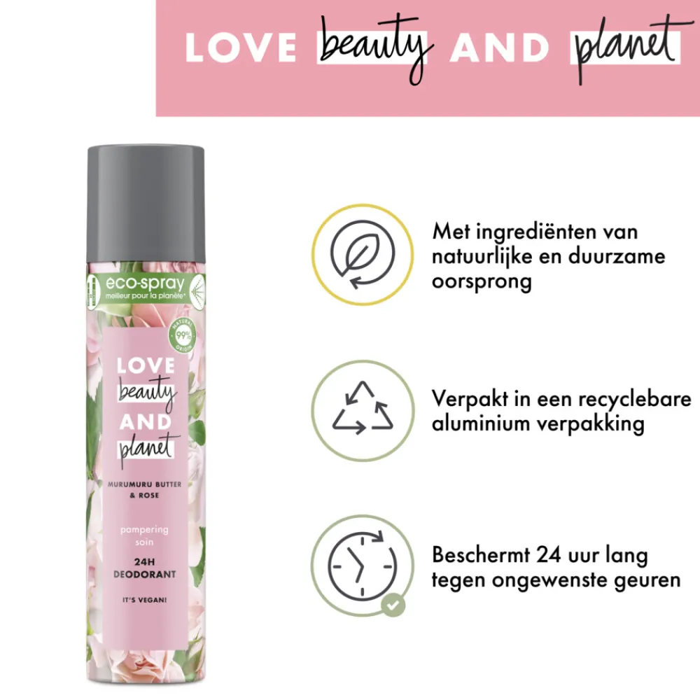 - Love Beauty and Planet Pampering Eco-spray Deodorant beschermt 24 uur lang