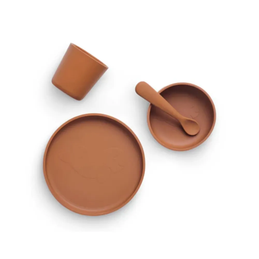 Dit kinderservies van Jollein is gemaakt van 100% siliconen. De set bestaat uit vier delen: een kommetje, een bordje, een lepeltje en een bekertje. Alle onderdelen kunnen in de vriezer, magnetron en oven. Ook is de set bestendig tegen de vaatwasser. Aan de onderkant van het kommetje en het bordje zit een handige zuignap.