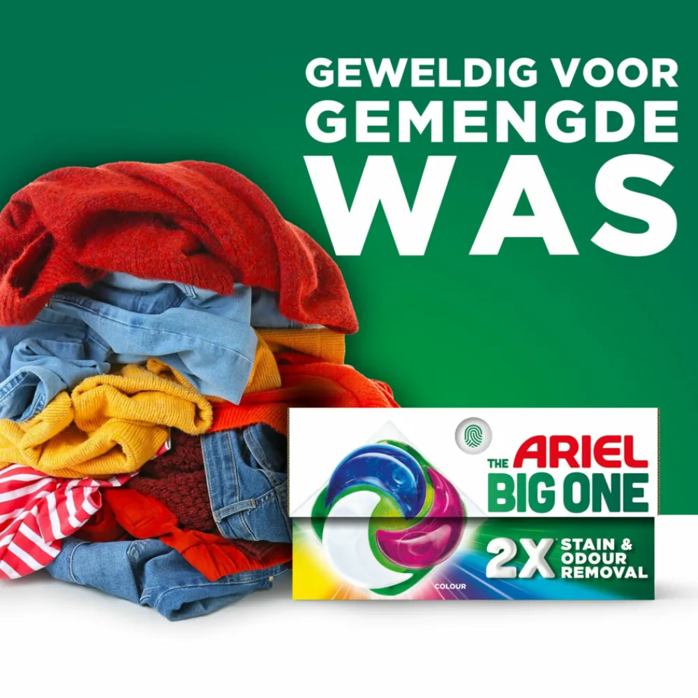 - Ariel The Big One wascapsules Stralende Kleuren. Speciaal ontworpen voor gemengde ladingen; opnieuw wassen hoeft niet, zelfs niet bij zwaar bevuilde was