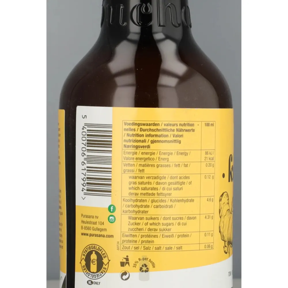 Purasana Kombucha Drank Gember is een licht koolzuurhoudende gemberthee dat ontstaan is door fermentatie. Fermentatie is een proces waarbij micro-organismen, zoals bacteriën, schimmels en gisten, worden gebruikt waarna er een probiotica- en enzymencultuur wordt gecreëerd. Kombucha is 100% biologisch, vrij van conserveringsmiddelen, vegan gecertificeerd en bevat geen toegevoegde zoetstoffen, geur-, kleur- of smaakstoffen.