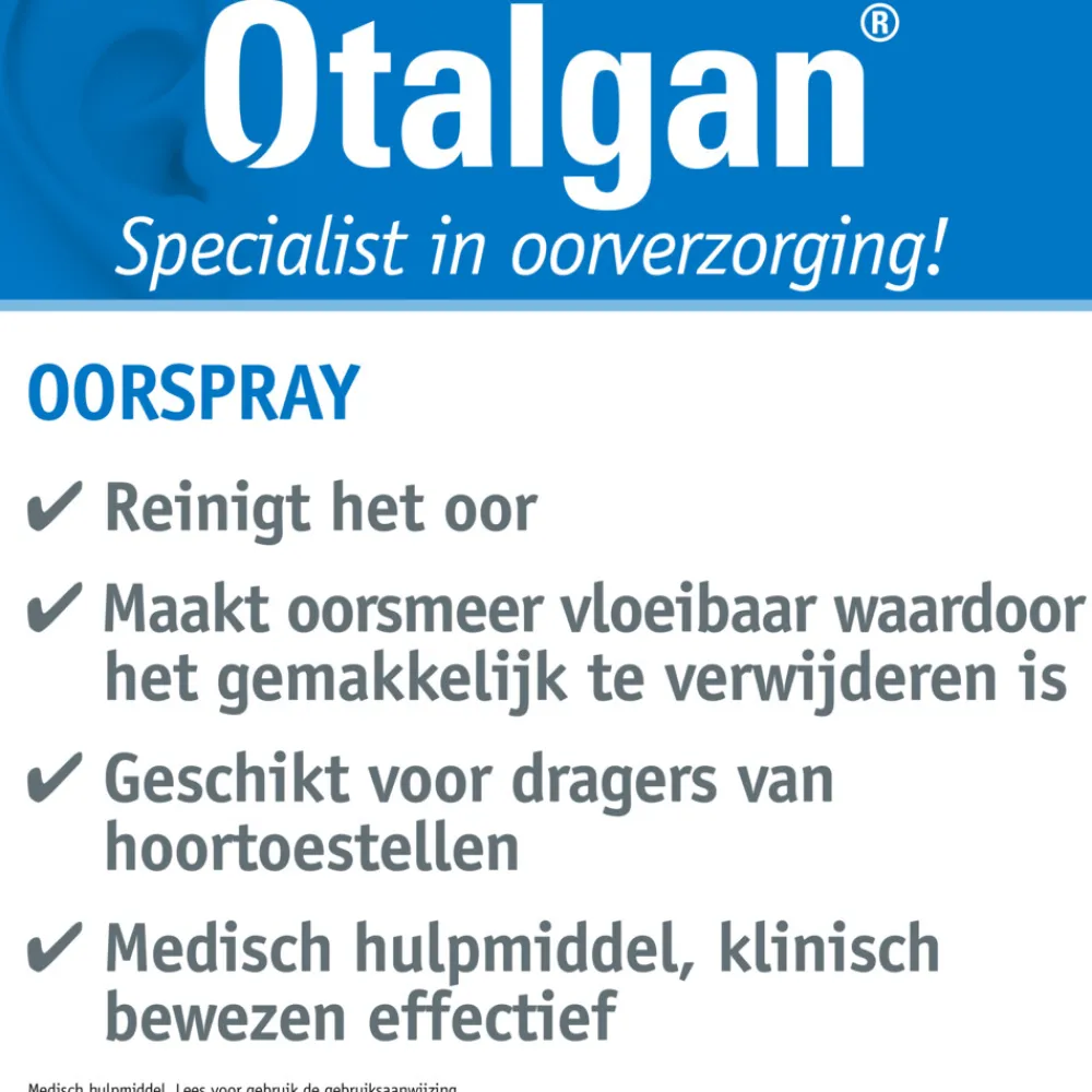 Medisch Hulpmiddel Otalgan Oorspray Hygiëne bestaat uit een zeezoutoplossing, die het oorsmeer vloeibaar maakt, waardoor het gemakkelijk te verwijderen is. Otalgan Oorspray is gemakkelijk en effectief bij de reiniging van het oor en een goede oor hygiëne. Otalgan Oorspray is voor uitwendig gebruik en geschikt voor volwassenen en kinderen vanaf 3 jaar.