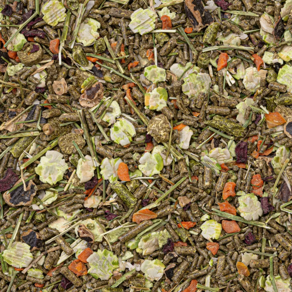 Verstrek dagelijks een verse portie voer, hooi van hoge kwaliteit en zuiver drinkwater. Richtlijnen hoeveelheid voer: zie voedingstabel verpakking.
