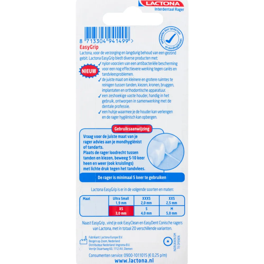 Lactona EasyGrip Ragers XS Rood 3.0 mm zijn ontworpen voor grondige en comfortabele reiniging tussen tanden en kiezen. De ergonomische zeshoekige grip zorgt voor optimale controle en ligt prettig in de hand. Voor beter bereik achter in de mond plaats je eenvoudig de dop op de achterkant van de grip. Handig en hygiënisch, ook voor onderweg. De rager heeft zachte, antibacteriële nylon haren en een kunststof gecoat ijzerdraad dat extra bescherming biedt aan tanden en tandvlees. Geschikt voor dagelijks gebruik, ook bij kronen, bruggen, implantaten en vaste beugels.