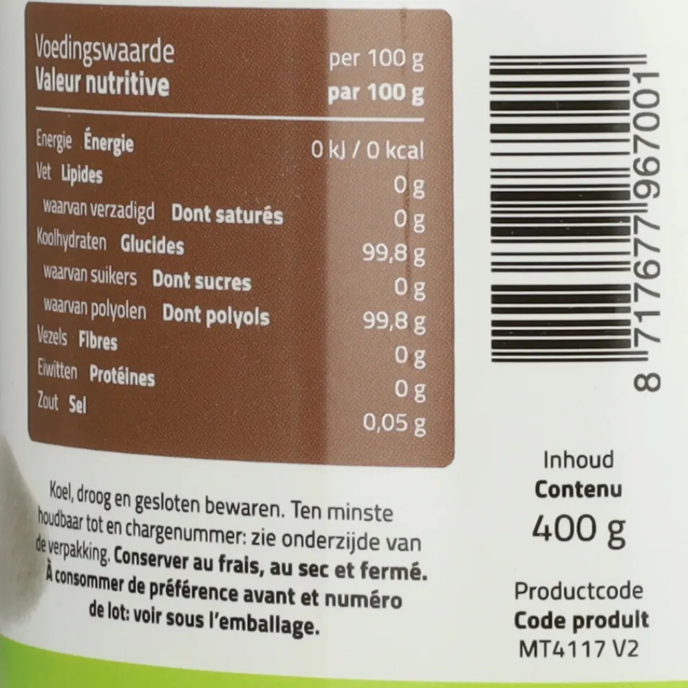 Natuurlijk alternatief van suiker en zoetmiddelen Erythritol is een natuurlijke zoetstof die van nature voorkomt in sommige paddenstoelen, vruchten (o.a. watermeloen, druif en peer) en gefermenteerde voeding zoals wijn, kaas en soja-saus. Erythritol is de enige natuurlijke polyol en is geproduceerd middels natuurlijke fermentatie en heeft ongeveer 70% van de zoetkracht van gewone suiker. Erythritol is een ideale vervanger van riet-, bietsuiker of andere zoetmiddelen. Geeft een heerlijke zoete smaak aan smoothies, yoghurt, tussendoortjes, dranken, ijs en andere (na)gerechten. Bevat geen calorieën, het wordt alleen opgenomen in de dunne darm en via de urinewegen uitgescheiden en hierdoor worden de calorieën van erythritol niet opgenomen. Erythritol beiënvloedt de bloedsuikerspiegel niet en is daardoor een goed alternatief voor diabetici.
