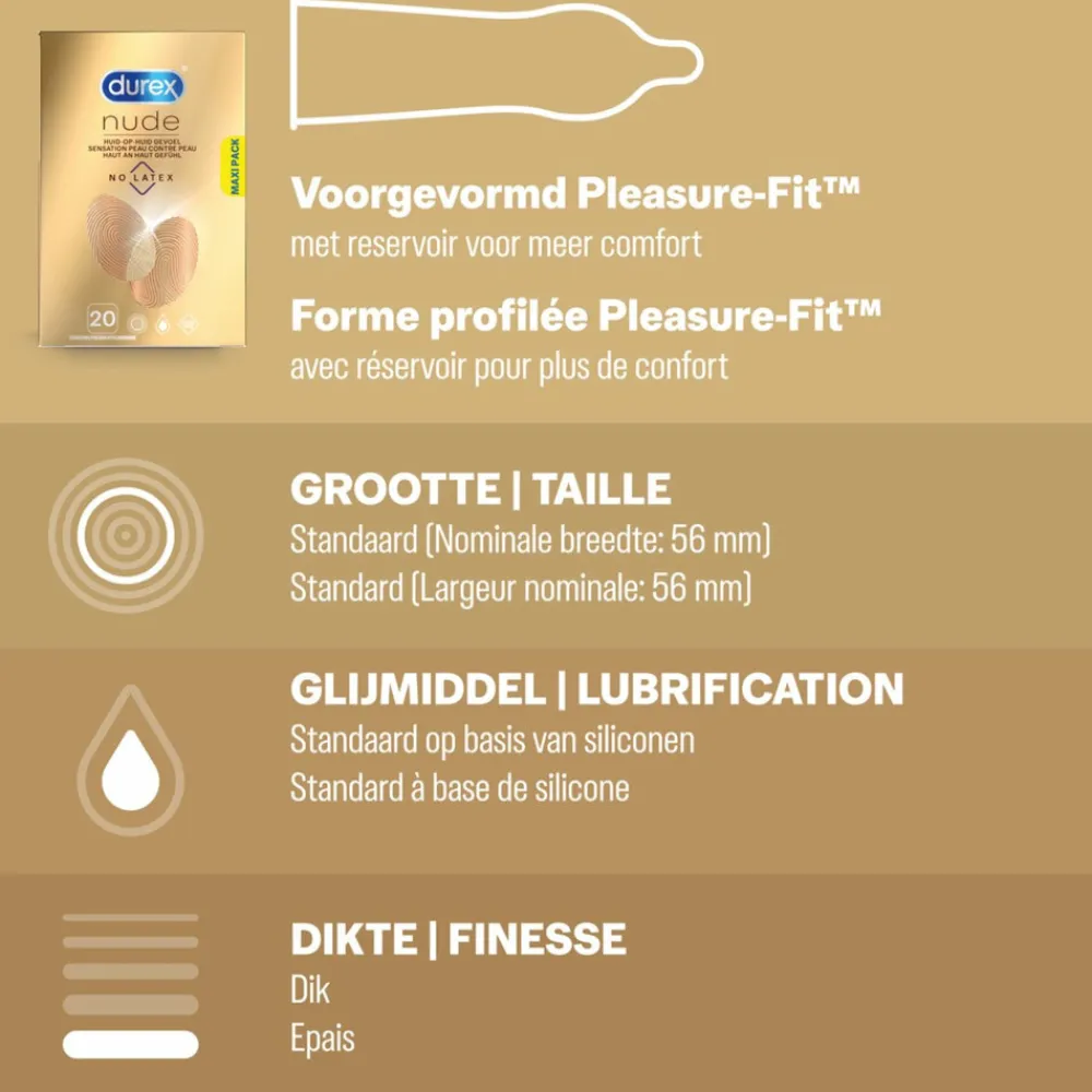 Durex Condooms Nude Latexvrij bieden intieme bescherming zonder latex, waardoor ze geschikt zijn voor mensen met latexallergieën. Deze condooms zijn ontworpen om je een natuurlijk gevoel en comfort te bieden zonder afbreuk te doen aan veiligheid.
